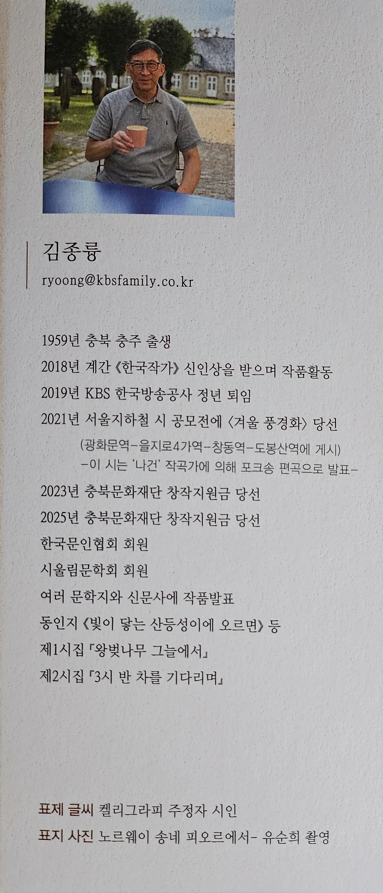 김종륭 시인의 두 번째 시집이 2025년 11월에 발간되었다. 소소한 일상생활서 일어나는 상황들 안에서 시상을 끌어와 편안하게 누구나 쉽게 공감할 수 있는 시를 쓴다. 김종륭 시인은 충주 출생으로 2018년 계간 <한국작가>의 신인상을 받으며 작품활동을 시작하였다. 그는 KBS 한국방송공사에서 근무하다가 퇴직을 하였다. 20여 년이 넘게 매년 동인지를 발간하고 있는 시울림에서 현재 동아리 회장으로 활동하고 있다. 2023년 <왕벚나무 그늘에서>라는 시집에 이어 충북 문예진흥기금의 후원을 받아 발간한 두 번째 시집이다. <3시 반차를 기다리며> 시집은, (1부 그 길을 걷는다) (2부 너와 나의 여정) (3부 3시 반차를 기다리며) (4부 희망의 봄을 위하여) 총 4부로 114편의 시가 실려 있다. 1집에는 시인의 누님께서 그린 유화 그림이었다면 두 번째 시집에는 아내가 북유럽 여행 때 바다낚시를 하는 시인의 모습이 담긴 사진이다. 발문은 20여 년이 넘도록 시울림을 이끌어 오고 계신 증재록 선생님께서 9면을 채워 주셨다.