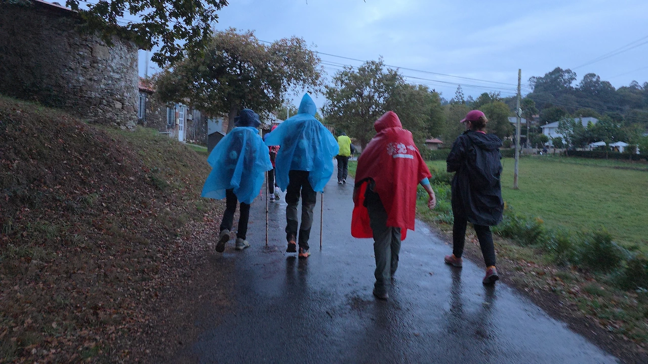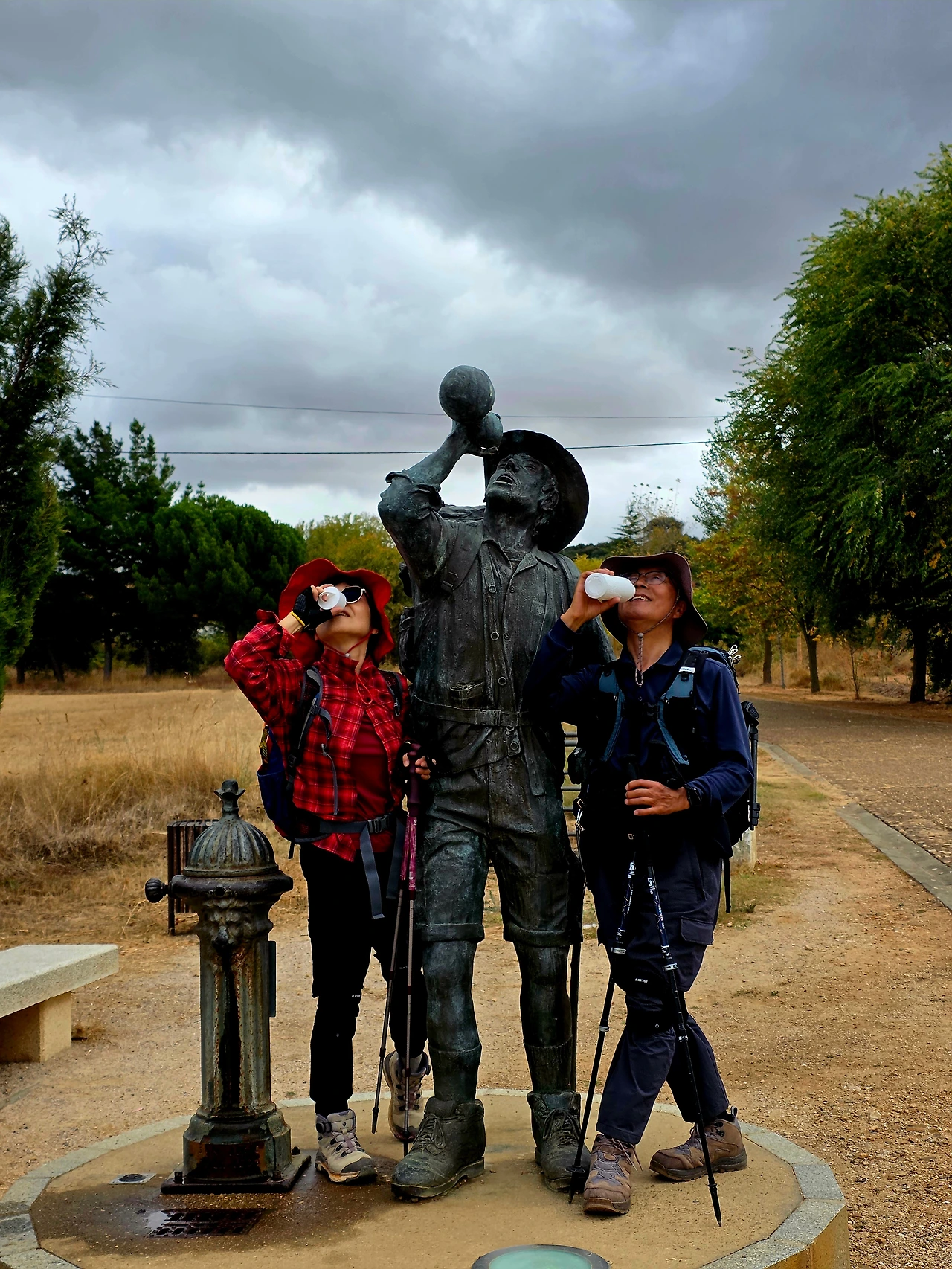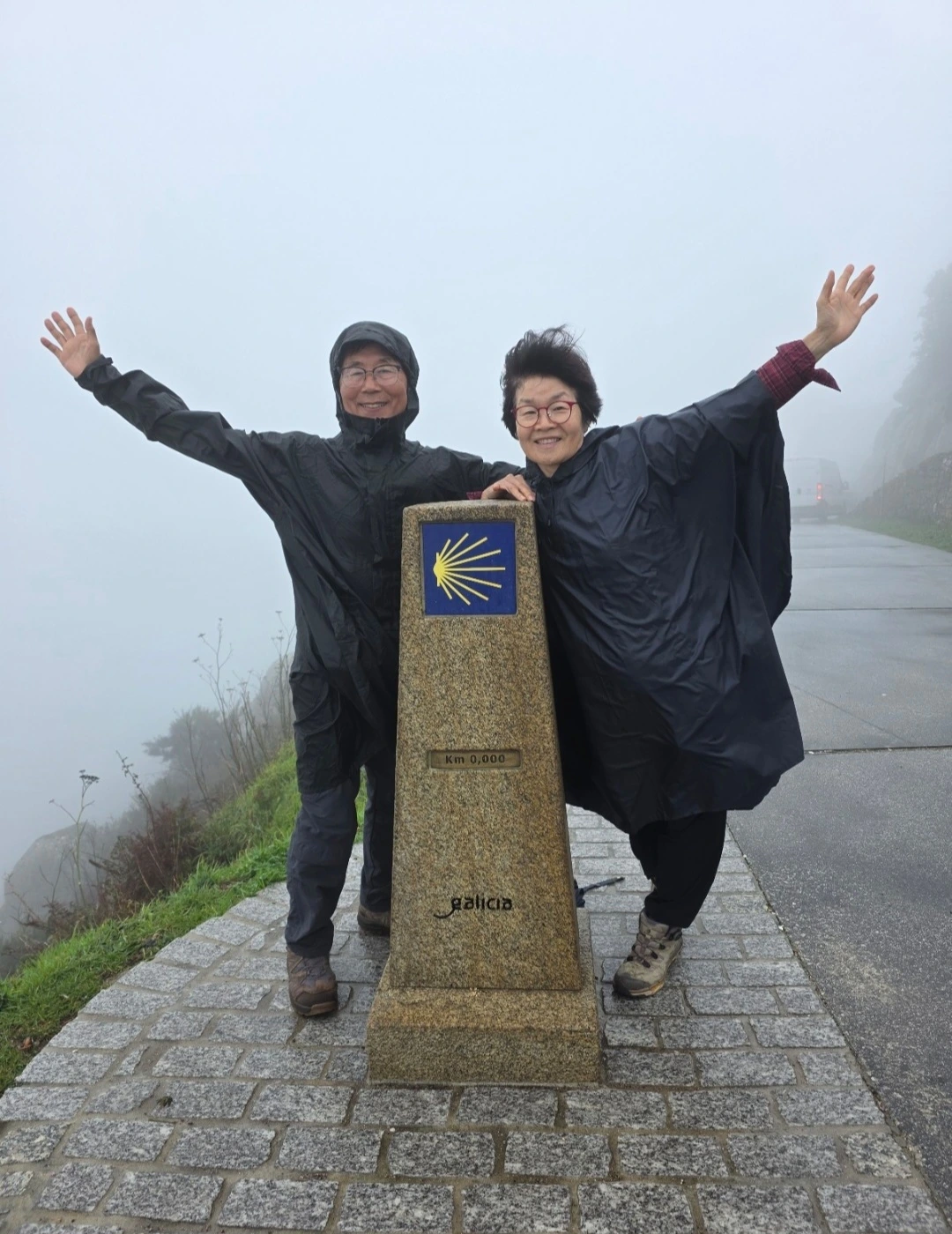 긴 여정의 메세타 고원을 걸을 때 무지개가 나타나 지루한 길에 위로와 희망이 되어 주었다. 우비를 쓰고 걸었던 시간들도 있었다. 배낭을 짊어지고 걸어서 우산을 못쓰고 우비로 몸을 가렸다. 바지와 신발은 촉촉이 젖었지만 이 길을 걸을 수 있음에 무한 감사를 드렸다. 햇볕이 쨍쨍한 날에는 모자를 쓰고 나무 아래에 잠시 쉬면서 순례길을 완주하고자 하는 마음을 다졌다. 클라라는 몸이 가벼워 그런지 앞장서 잘 걸어 다행이다. 아스트로가 '목마른 순례자' 동상 앞에서 우리도 순례자가 물을 마시는 것처럼 갈증 난 목을 적혔다. 왜 이곳에 순례자 동상을 세웠는지 알 것 같다. 수많은 순례자들이 이곳을 지나며 목마름을 채워주는 동상을 봤을 것이다. 지친 순례자들에게 손을 내밀어주고 갈증을 채워주는 것 같아 마음이 든든했다. 가장 많이 순레자들이 출발한다는 사리아에서 인증숏을 남기고, 100킬로 지점에서도 이곳을 지나는 많은 순례자들처럼 사진을 찍었다. 확실히 사리아부터는 사람들이 많아졌다. 그동안 걷느라 힘들고 지쳤지만 힘을 내 걸어 보기로 했다. 주변의 경치도 살펴 가면서 부지런히 걸었다. 햇살은 뜨거웠지만 산티아고 데 콤포스텔라에 도착하는 꿈을 꾸면서, 다른 순례자들의 스틱 소리를 들으며 힘을 내 본다. 우리는 10월 20일 드디어 도착지에 안착했다. 그토록 꿈 꾸며 와보고 싶었던 산티아고 데 콤포스텔라에 오니 마음도 홀가분하고 덩달아 다른 사람들의 모습을 감동이 되었다. 프란치스코 씨가 보내준 사진을 보고 같은 입장이 되어 순례길을 정리했다.