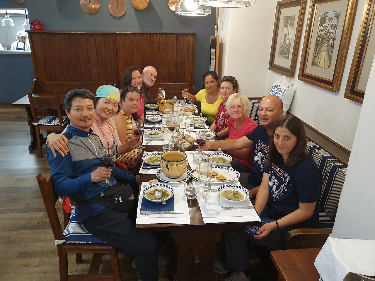 12시에 프란치스코 성당으로 갔고 앞쪽에 자리를 잡았다. 미사 시간이 다가오면서 순례객들이 들어오니 왼편으로 계속해서 의자를 보충했다. 주말이라서 사람이 더 많은 듯했다. 성체를 받아 모시고 점심 식사 초청받은 빠라도르 호텔로 갔다. 벌써 몇 명이 호텔 앞쪽에 와 있었는데, 아침에 줄을 서며 얼굴을 익힌 터라 반갑게 인사를 나누었다. 오후 1시에 오픈했고 우리는 들어가 호텔 레스토랑 한쪽 미리 세팅해 놓은 테이블에 앉았다. 서로 반갑게 인사를 나누고 요리를 기다리며 사진도 찍었다. 애피타이저로 식욕을 돋우기 위해 빵과 수프가 나왔다. 본 메뉴는 돼지고기 스테이크와 후식은 생크림이 섞인 빵이다. 맛도 좋았고 기분도 좋았다.