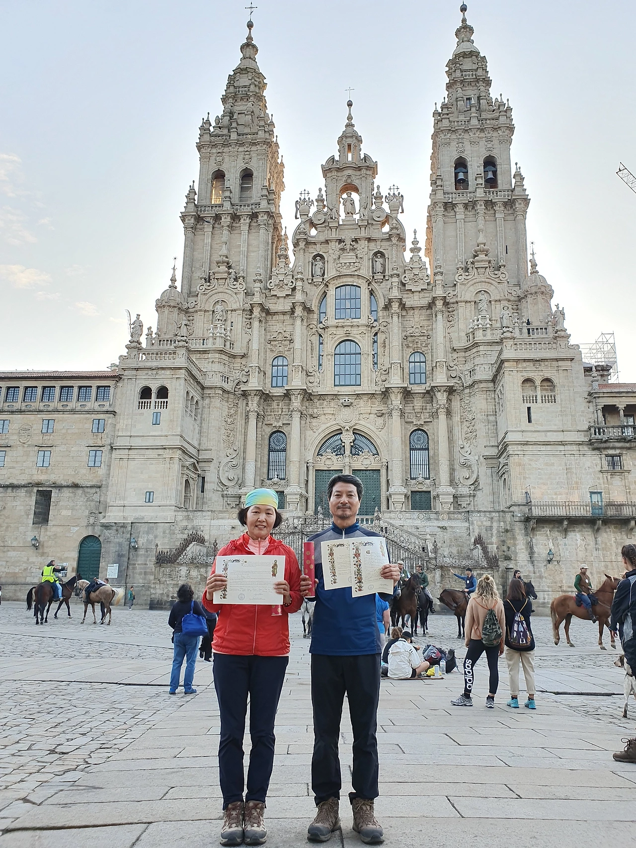 2019년 8월 14일 프랑스 국경 마을 생장을 출발하여 9월 14일 32일 만에 산티아고 데 콤포스텔라에 도착했다. 160여 개 마을을 거치고 800킬로를 완주했다는 자부심과 기쁨이 넘쳐 남편과 뜨거운 포옹을 했다. 우리는 산티아고 대성당 광장으로 와서 사진을 찍었다. 감격의 기쁨을 남편과 광장에 모인 모든 사람과 지인들과 나누고 싶었다. 말을 타고 온 동호회도 있었는데 사진을 찍느라 30분을 설쳐대는 바람에 오물과 시끄러움에 압도되었다. 그들이 떠나고 어느 정도 수습된 후에 우리도 어떡하면 사진이 잘 나올지에 대해 이리저리 포즈를 바꿔 찍어 보았다. 앉아서도 돌아서서도 찍고, 둘이 포옹도 키스도 하며 마음껏 기쁨을 누렸다. 가장 소중한 순간을 사진으로 마음으로도 담아야 했다.