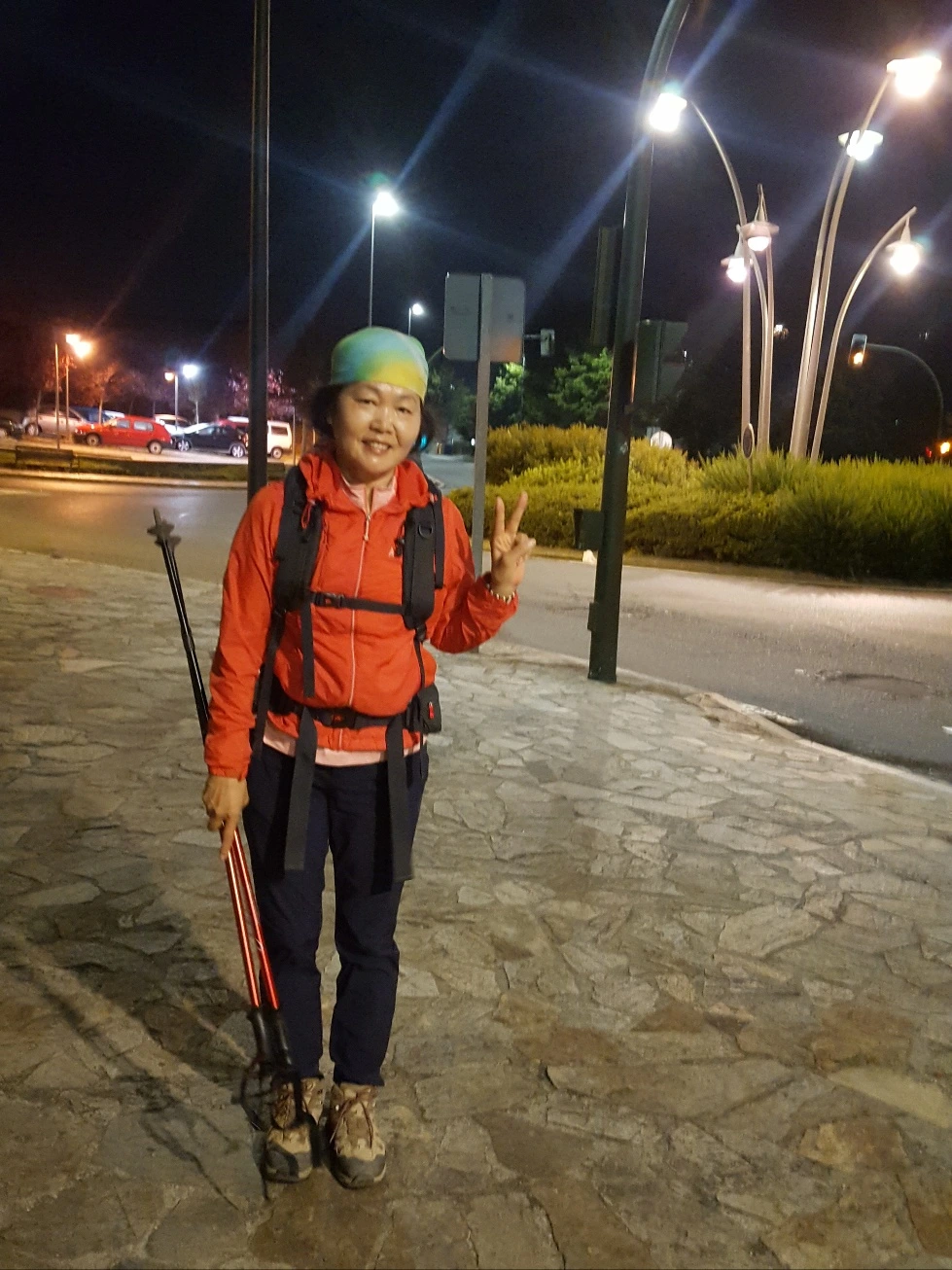 산티아고 입성 전날에 33km를 걷고 몬테 도 꼬죠에 도착하였다. 우리 부부 2명이 묵을 수 있는 조용한 방을 얻어 짐을 풀었다. 사람들이 북적이는 대형 알베르게가 아닌 곳에서 편안하게 보내기 위해 과한 비용을 지불했다. 일찍 도착한 순례자 열 명에게 주는 혜택을 받기 위해서이다. 이제 5km 순례길을 걸어가면 야고보 성인의 무덤이 있는 산티아고 대성당에 도착하는 날이다. 새벽 4시 알람 소리에 잠이 깼다. 서둘러 준비하고 산티아고를 향해 보름달이 밝혀주는 길을 걸었다. 새벽 공기가 신선하다. 15분 정도 걸으니 다리로 이어지며 산티아고 도시로 들어갔다. 언덕에서 볼 때는 가까웠는데 계속 걸어가야만 했다. 가다 보니 조개 표시가 끊겨 잘 가고 있는지 걱정되었다. 차를 멈춘 분에게 다가가서 물어보았더니, 다행히 잘 걸어왔나 보다. 앞으로 쭉 가면 된다고 친절하게 알려 주었다. 아직 달은 떠 있고 별도 떠 있다.