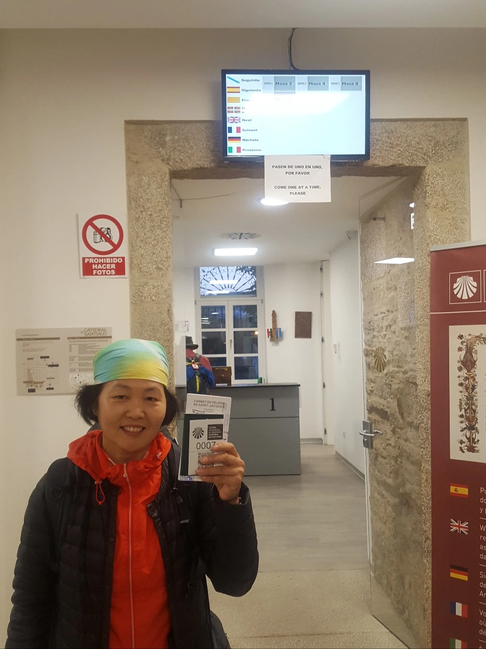 우리 부부는 산티아고 데 콤포스텔라에 가기 위해 32일을 걸었다. 산티아고 입성을 남겨두고 있는데 가슴이 벅차오른다. 무탈하게 이 길을 걸을 수 있었고, 한국에서 온 카미노 친구들을 만나 즐겁고 풍성한 순례를 했음에 무한 감사를 드린다. 길 위에서 만났던 외국인들도 머릿속에 스쳐 갔다. 순례하는 동안 기도로 응원해 주신 분들께도 감사를 드린다. 묻고 또 물어서 산티아고 대성당을 들려서 순례자 사무소를 찾아갔더니 몇 사람이 있었다. 우린 여유롭게 바로 뒤 배낭을 놓고 섰다. 그래서 6등과 7등으로 열 명에게 제공한다는 식사권과 박물관 이용권을 받을 수 있을 것 같다. 오전 8시에 순례자 사무실이 문을 열었고 직원 안내를 받으며 순례 증서에 이름을 자필로 쓰고 순례 확인증을 받았다. 사무실을 구경하고 한 바퀴 둘러서 나오니 대기 번호표를 받고 사람들이 거의 흩어졌다.