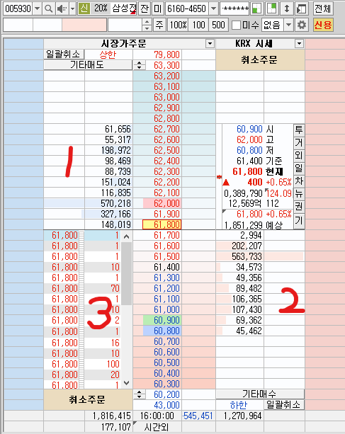 위 호가창에서는 62,000원에 매도 물량이 많이 쌓여 있는 것을 볼 수가 있다. 해당 가격에서 팔고 싶은 시장 참여자가 많다는 것이다.