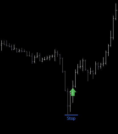 긴 아랫꼬리를 가진 바(spike)가 형성되고 그 바의 저점을 하향돌파하지 않는 횡보 구간이 형성되면 진입을 고려할 수 있다.