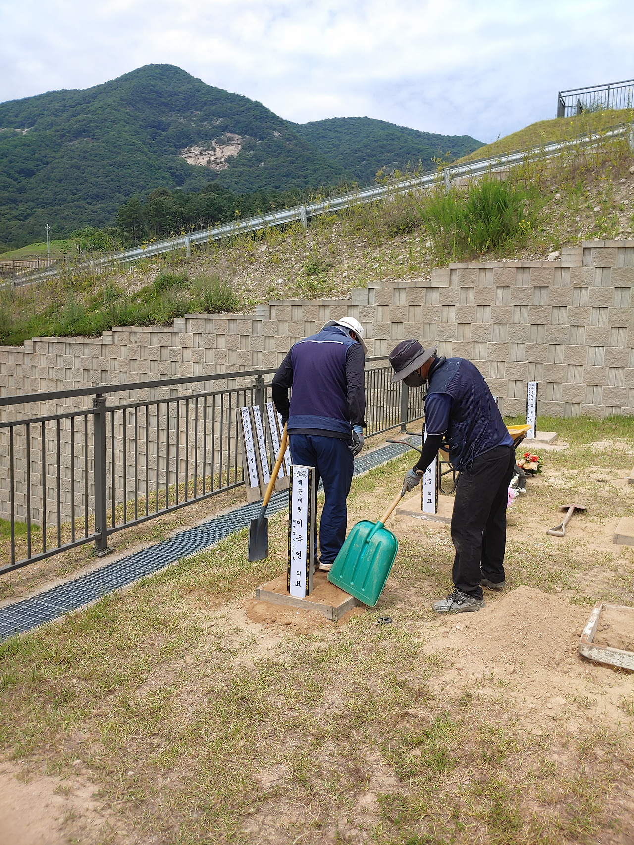 석비 제작 전 임시 목비를 세우는 장면 아빠 인생 계획의 마지막 페이지가 드디어 채워졌다. 유비무환이라는 군인정신으로 똘똘 뭉쳤던 아빠는 자신의 죽음과 장례 절차 하나하나까지 계획하고 실행하셨다. 죽음 이후의 일도 아빠 자신이 진두지휘하길 바라셔서 상조회 연락처를 수도 없이 확인하고 본인이 직접 전화까지 하셨던 아빠였다. 삐뚤삐뚤한 글씨로 장례 식순까지 직접 쓰셨다. 사회, 기도, 찬송, 그리고 자신의 약력까지. 진짜 장례식을 하면서 기시감이 든 것은 아빠가 장례식 연습하는 것을 하도 보아서였을 것이다. 연습에 연습을 거듭하는 아빠에게 핀잔을 주고 때로는 화도 냈었다. 대체 왜 그러시는지에 대한 수수께끼는 우연한 기회에 풀렸다.