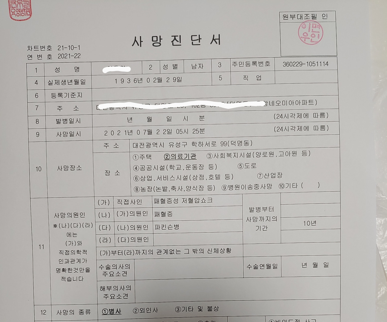 아빠의 사망진단서 나는 아빠의 사망진단서 타령이 비로소 이해되었다. 아빠의 사망진단서에는 사인이 패혈증성 저혈압 쇼크로 나와 있다. 아빠가 그토록 원했던 ‘병사’로 진단받은 것이다. 왜 그렇게 병사에 집착하는지 비로소 알게 되었다. 그때 이모부의 사인을 밝히기 위해 노심초사 타들어 갔던 아빠의 마음이 거기 있는 것이다. 병사로 인정받으면 경찰의 수사가 필요치 않은 것을 아빠는 알았던 것이다. 자신을 위해서가 아니라 당신의 죽음을 마주한 엄마를 위해서, 엄마의 마음고생을 줄여주기 위해 의사의 진단이 절대 필요했던 것이다.