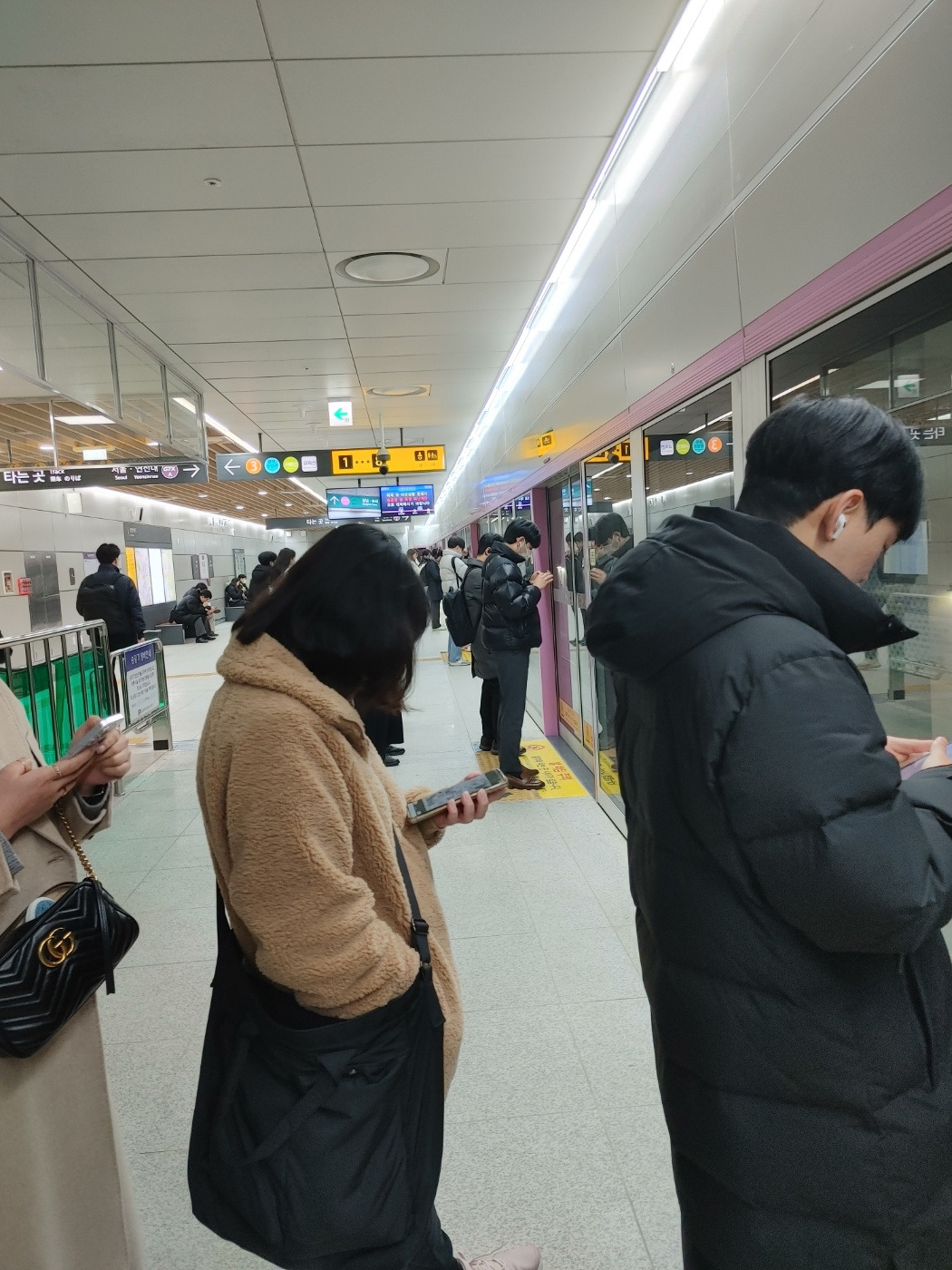 휴일 탑승은 여유로웠을 테니 출퇴근 시간에도 이용해 봐야 제대로 평가를 해볼 수 있겠지. 월요일은 일찍 출근하는 날이라 광역버스를 타러 갔고, 화요일에 이용해 보기로 했다. 1월 3일 화요일, 7시에 일어나 출근준비를 하고 7시 42분에 집을 나섰다. 버스를 타고 대곡역에 도착한 시간은 7시 58분. 시간표를 보니 8시 9분 차를 탈 수 있다. 5분 정도 걸려 지하 8층 승강장에 도착해서 열차를 기다리다 보니 어느새 줄이 길어졌다.