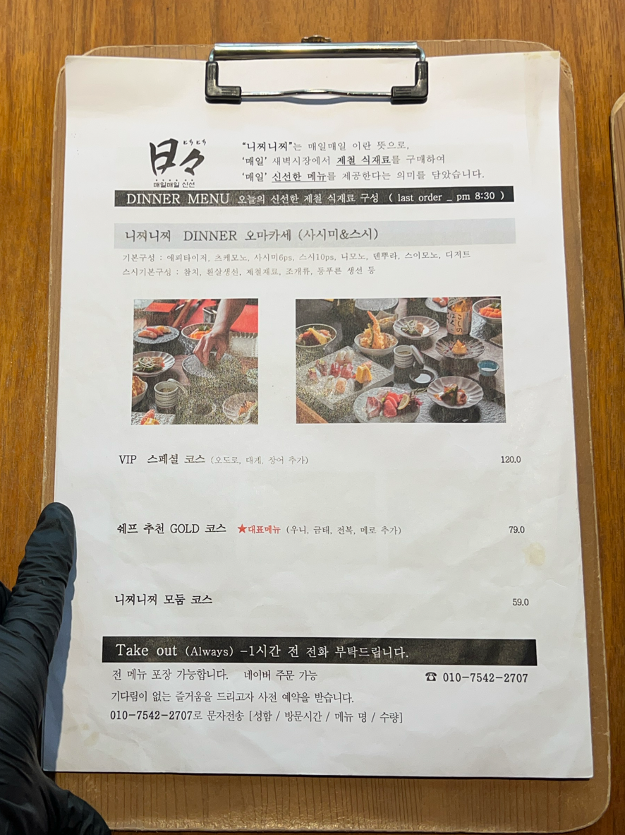 원래는 2시반 퇴근인데 2시에 그만 들어가라는 사장의 말에 얼굴에 화색을 띄우며 조용히 Dinner용 메뉴판을 테이블에 올려두었다.