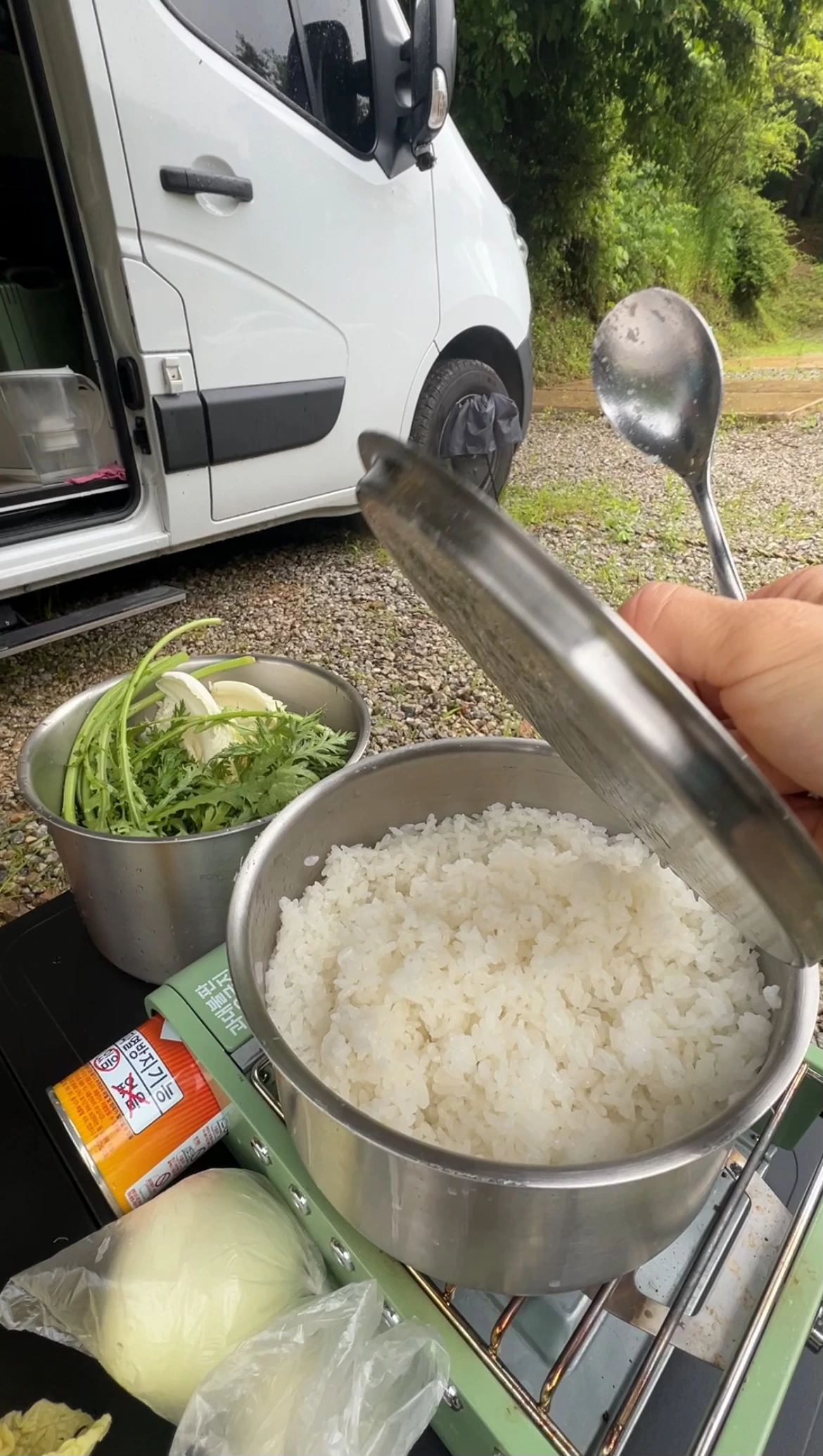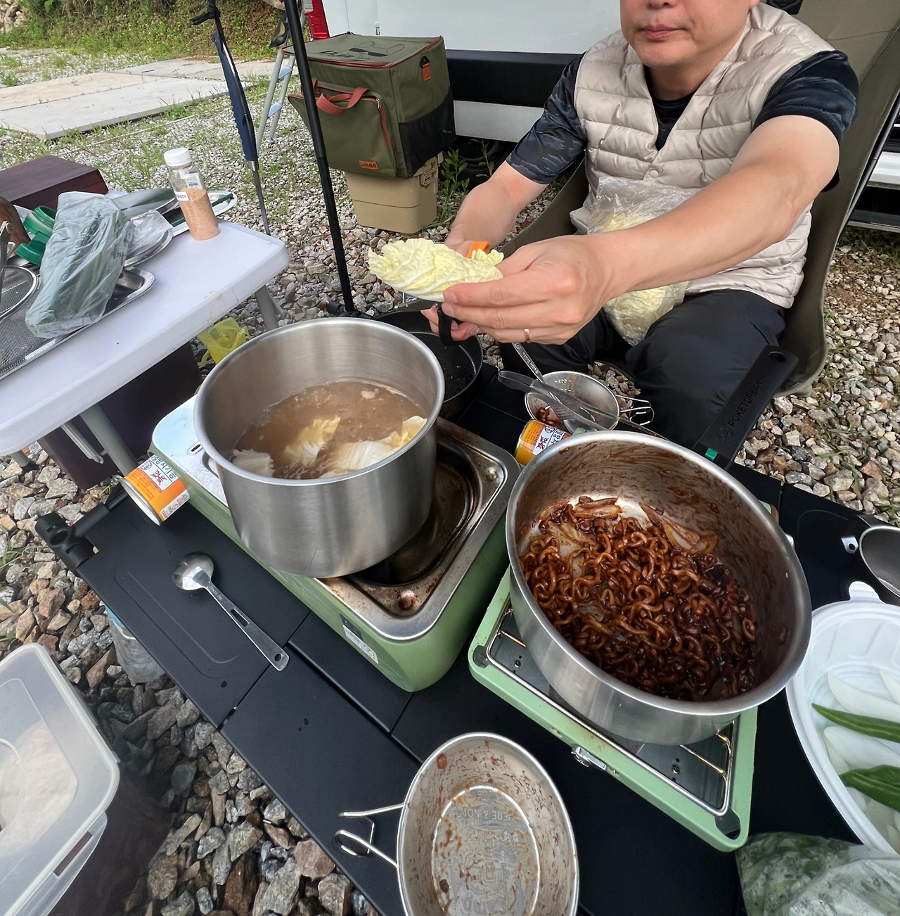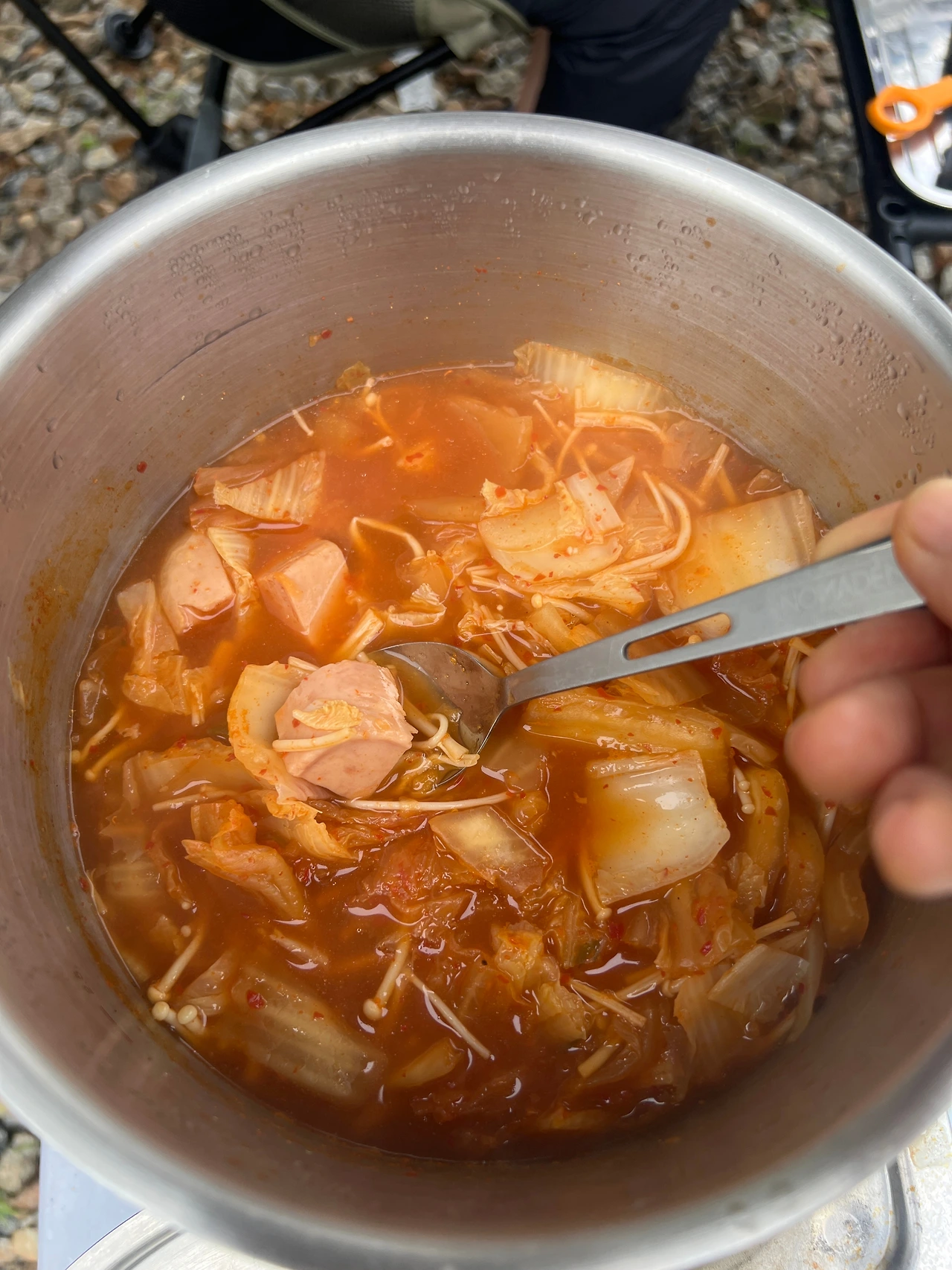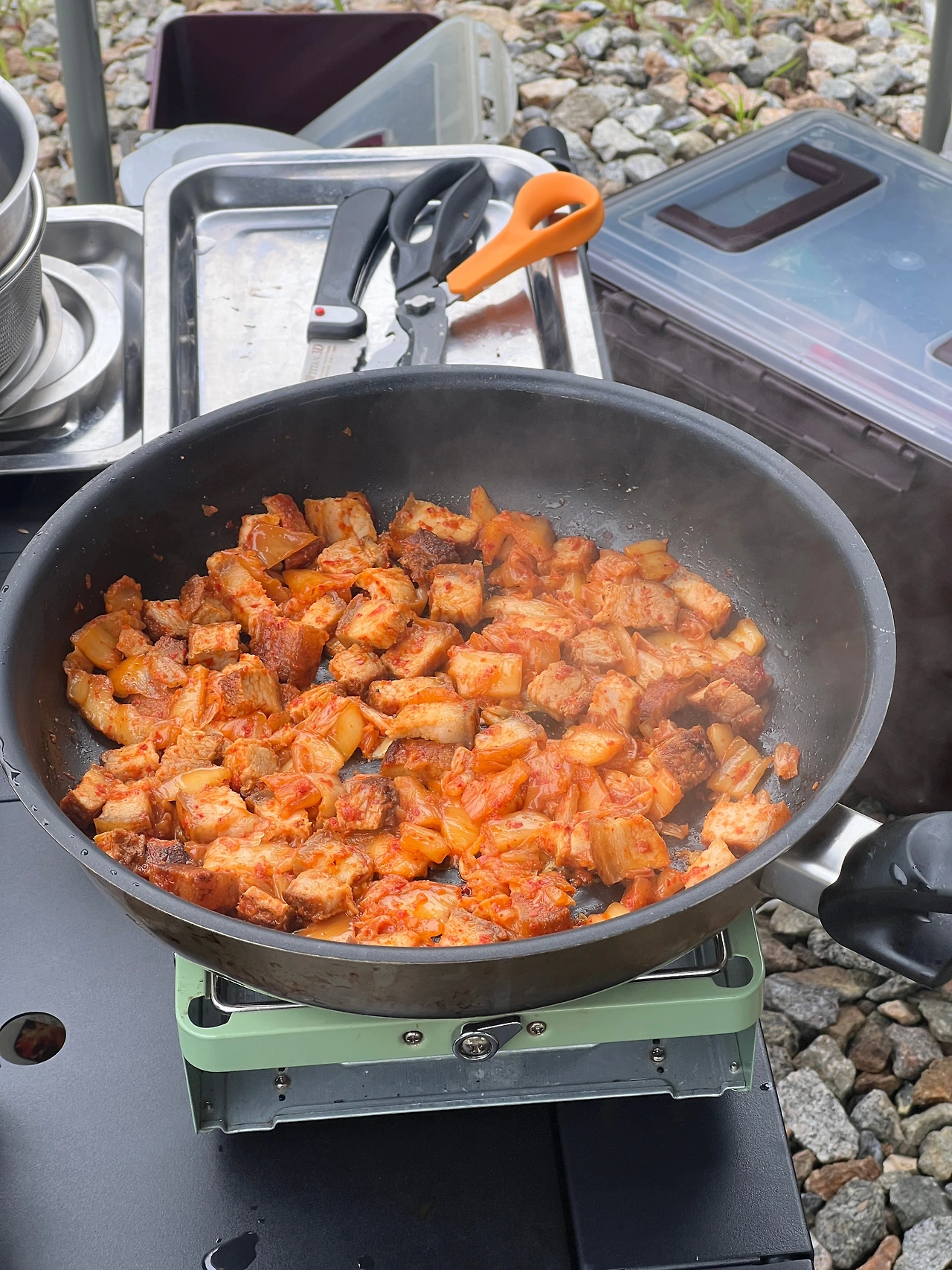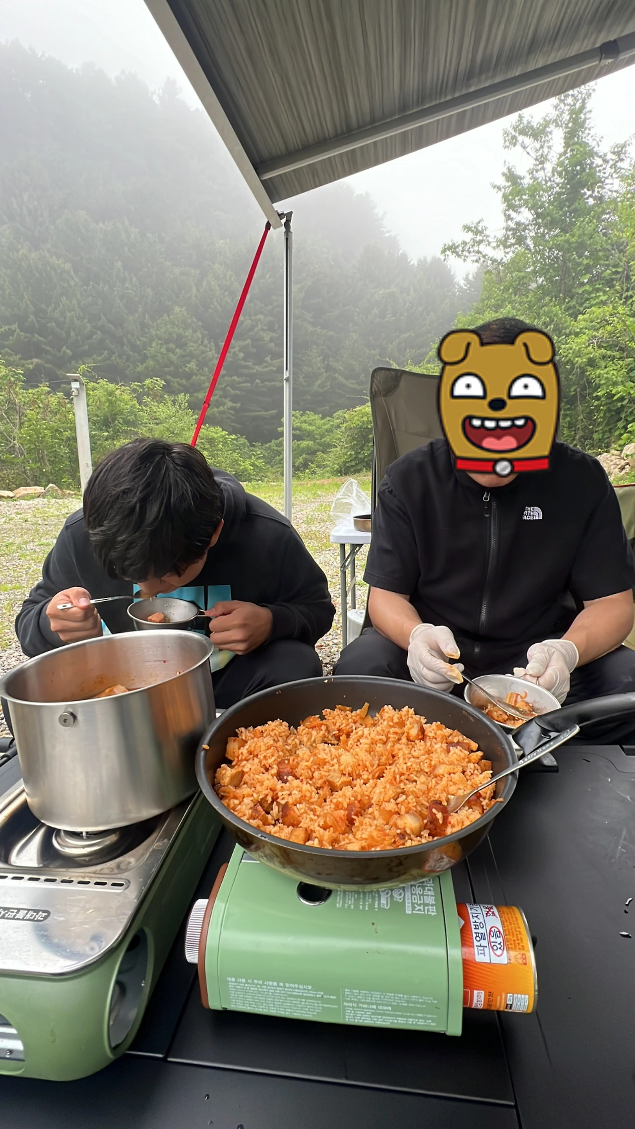 대략 30분동안 휴대용버너에서 노릇 바삭하게 잘 구워진 돼지고기, 집에서 가위로 썩뚝썩뚝 대충 썰어온 김치, 얇게 저며 매운맛을 조금 덜어낸 마늘과 캠핑장에서 보글거리며 즉석으로 한 냄비밥까지...