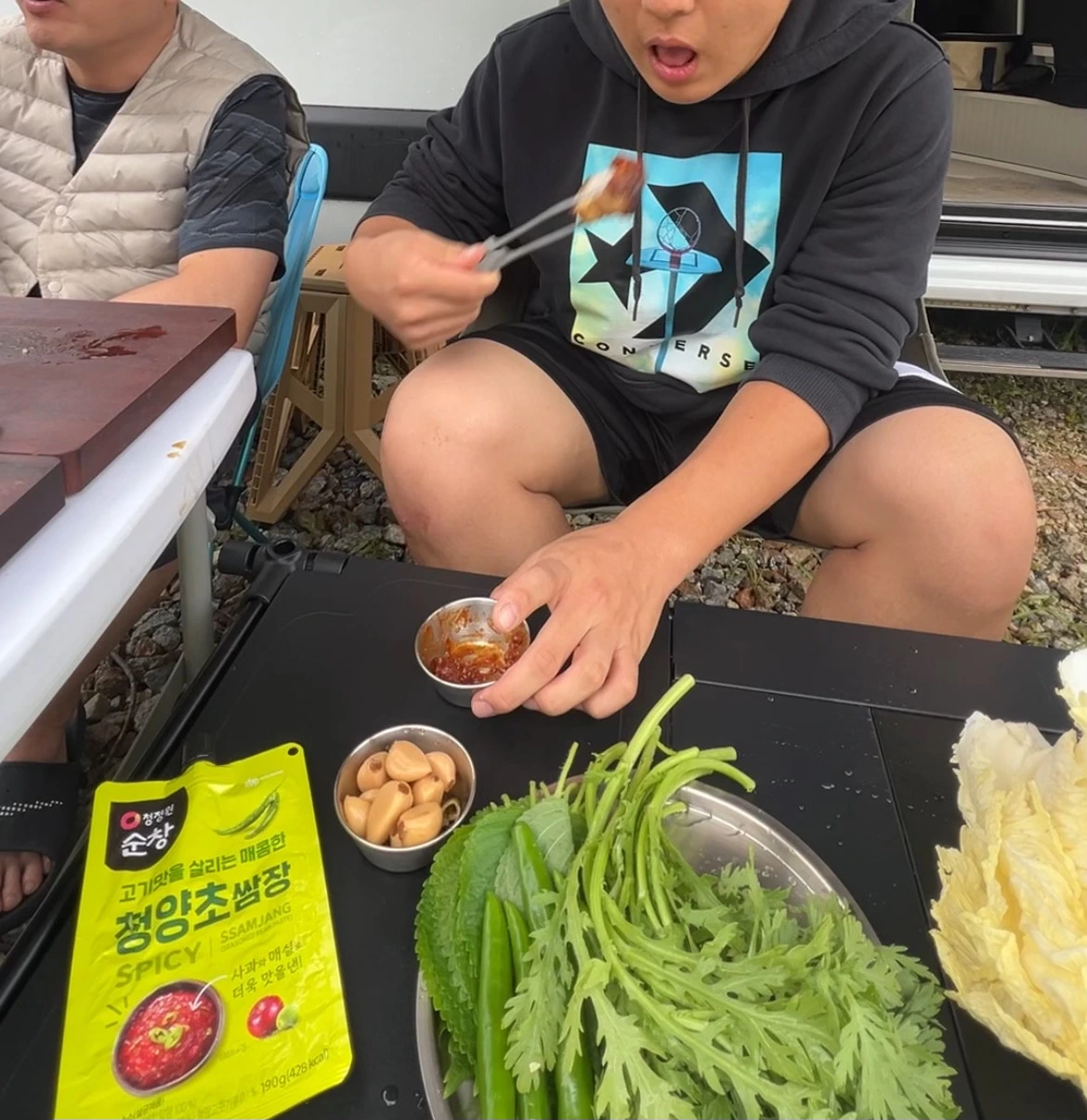 캠핑장에서는 보통 젓가락은 잘 사용하지 않는 편이기에 오늘도 우리는 집개로 고기를 구워 그대로 집어 먹으니 작은 소도구을 통해서도 고기맛에 변화가 일어났다.