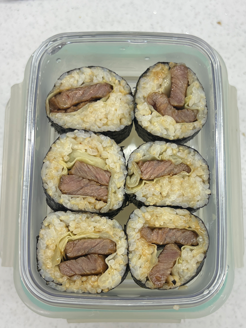 고기넣어서 김밥 말았으니 학교가서 아침으로 먹어.