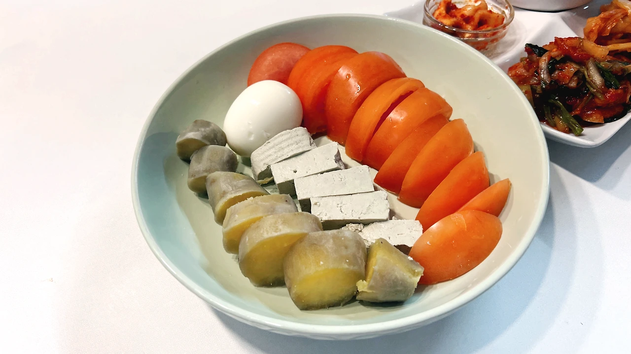 오늘 외부 활동이 있은 뒤에 오후 2시반에서야 먹은 식사는 곡물대신 고구마로 대체, 단백질로 계란과 두부, 토마토 1개를 곁들여 준비했다.