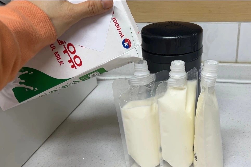 기존에 있던 요거트를 종균으로 사용하여 200미리 음료파우치에 약 30미리씩 넣고 우유를 부어줍니다.