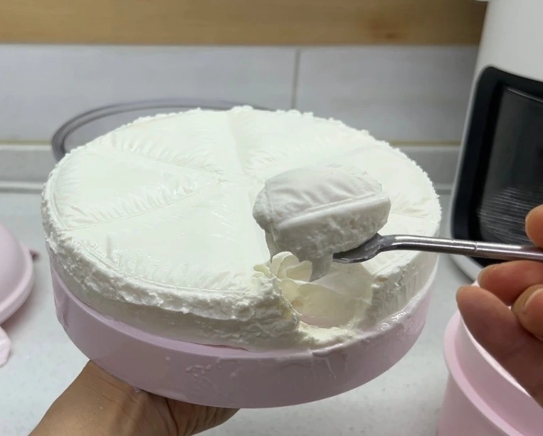 꾸덕한 정도를 살펴보니 갓 만들어진 그릭요거트가 정말 신선해 보입니다.