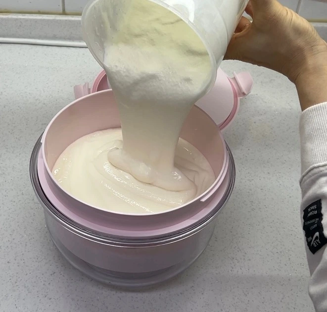 10시간이 지나고 나서 발효유를 확인해보니 잘 된것 같아서 발효유를 기계에서 꺼내고 난후 잠시 식혀주는데요, 이때 커드가 깨지지 않도록 주의해주시는게 좋아요.