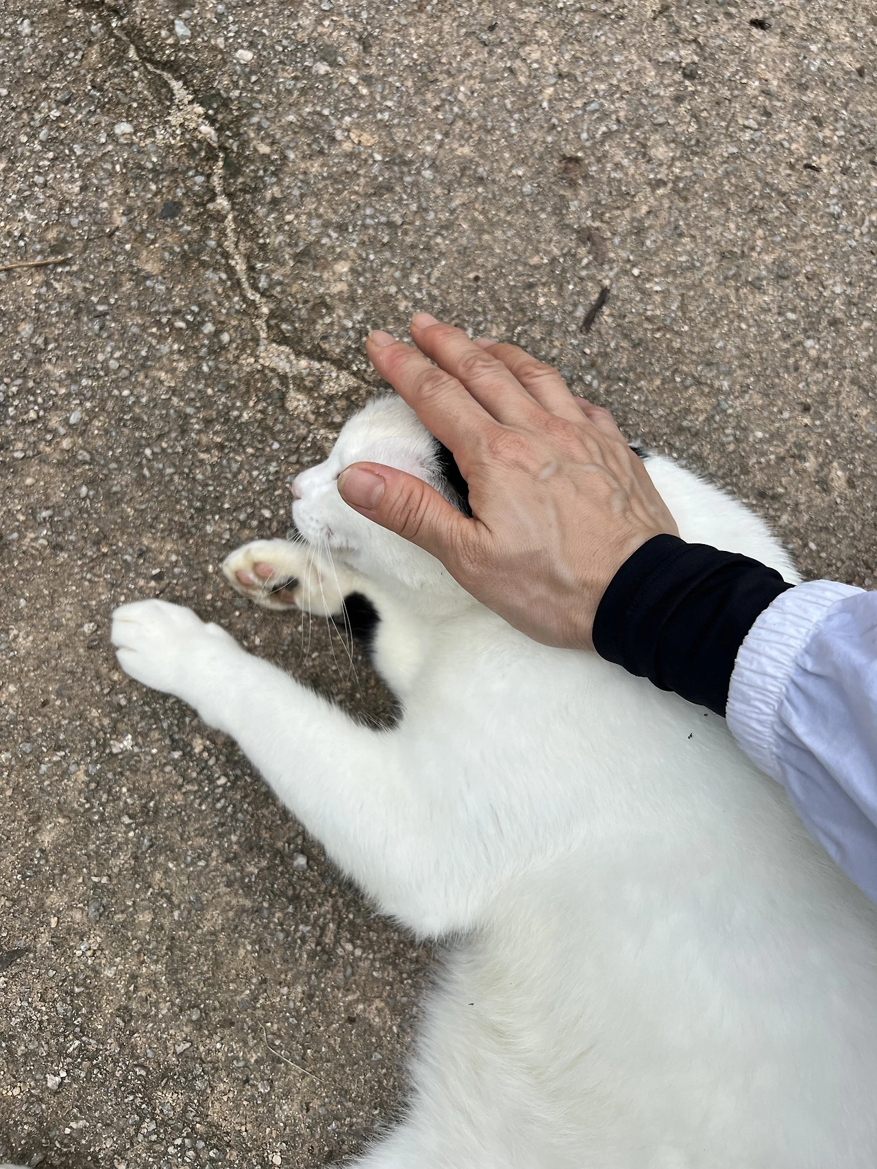 걷다가 만난 길냥이가 머리를 만져달라며 바닥에 드러누웠어요.