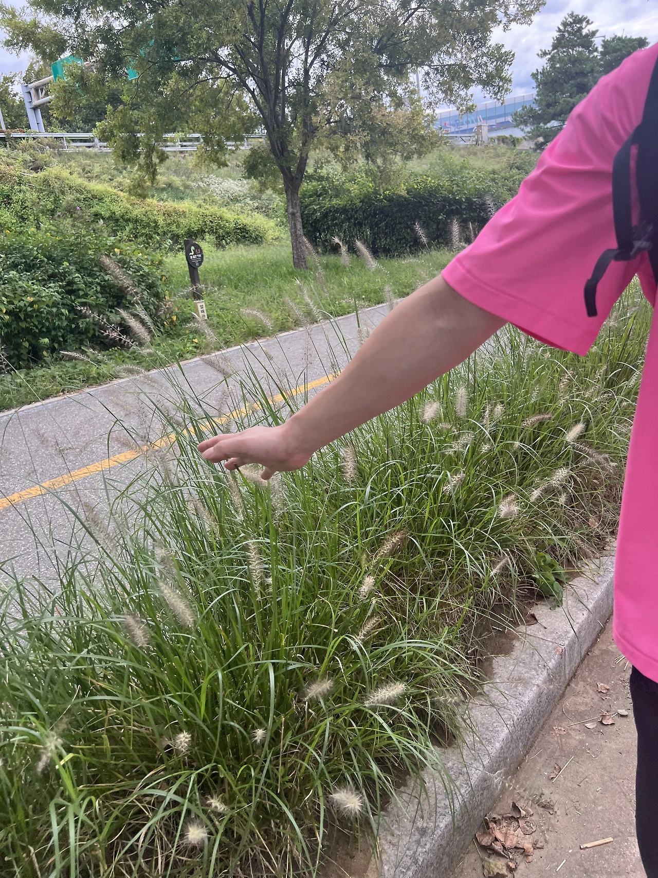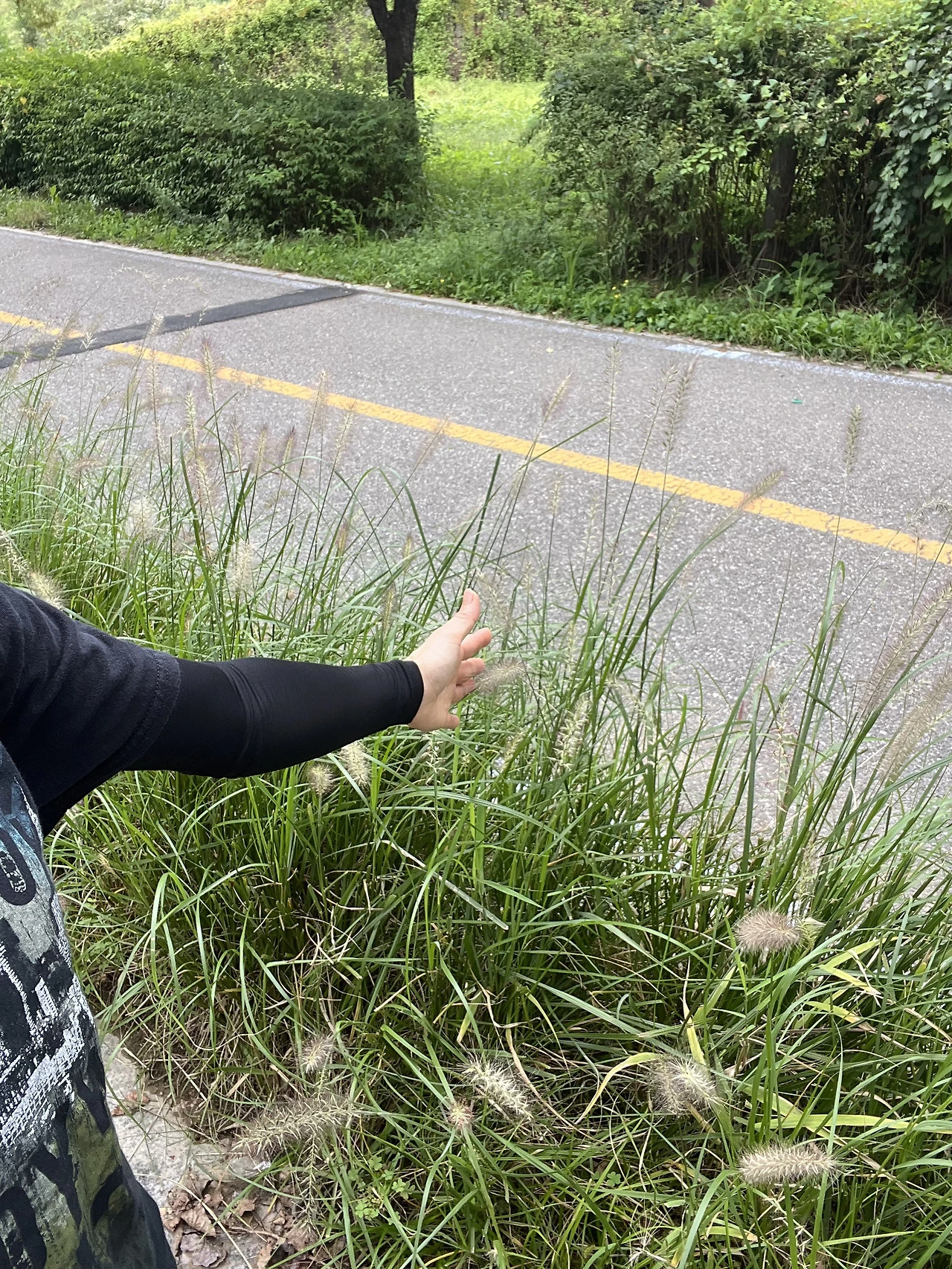 강아지풀이 짝꿍의 손에도 인사를 건내네요.