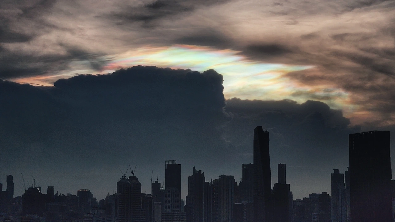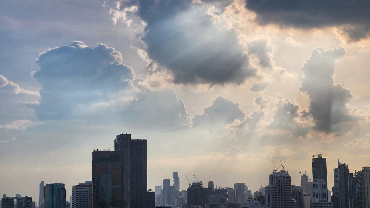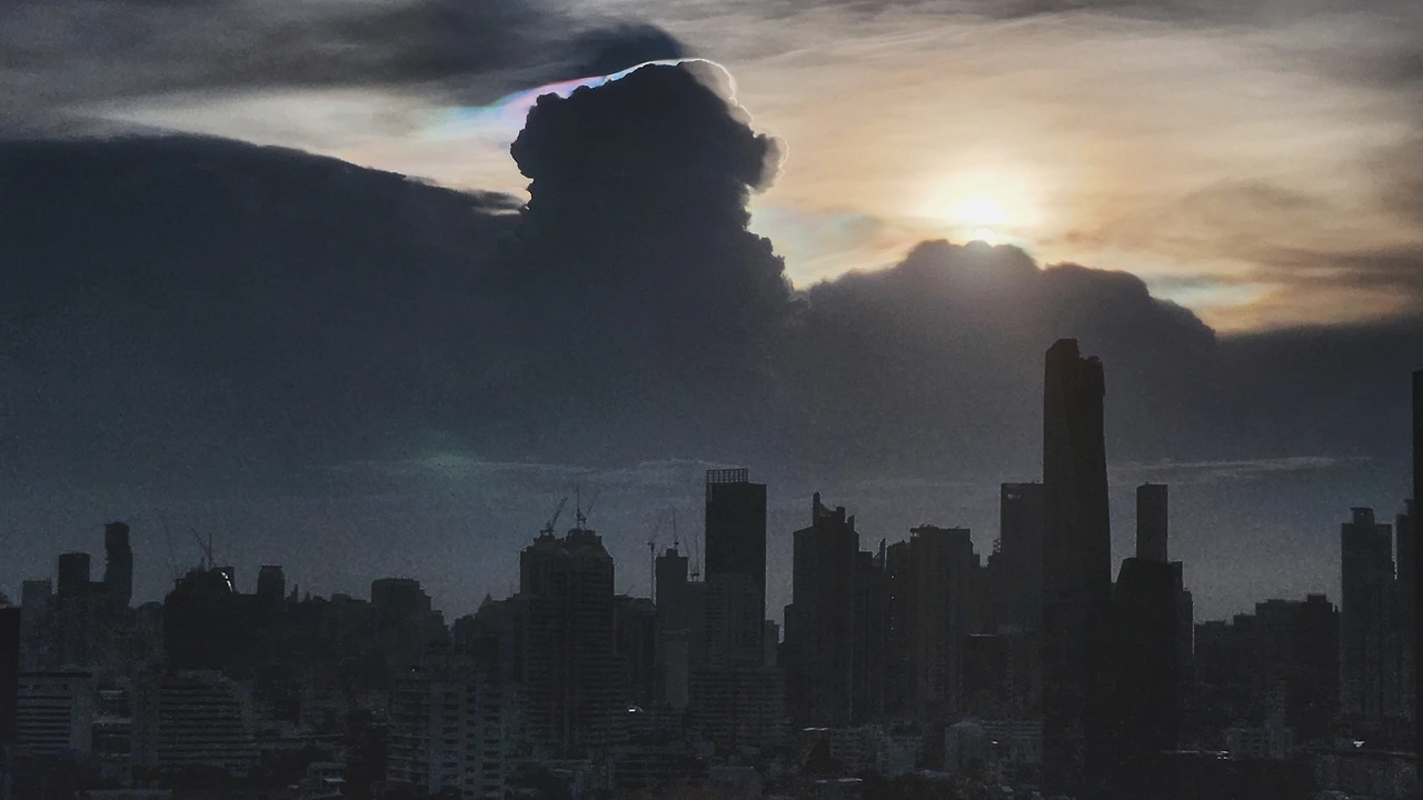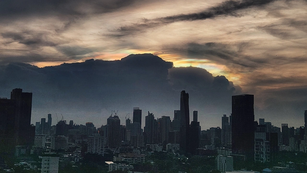 해가 지는 방콕 도시 풍경 위에 떠 있는 신비로운 구름