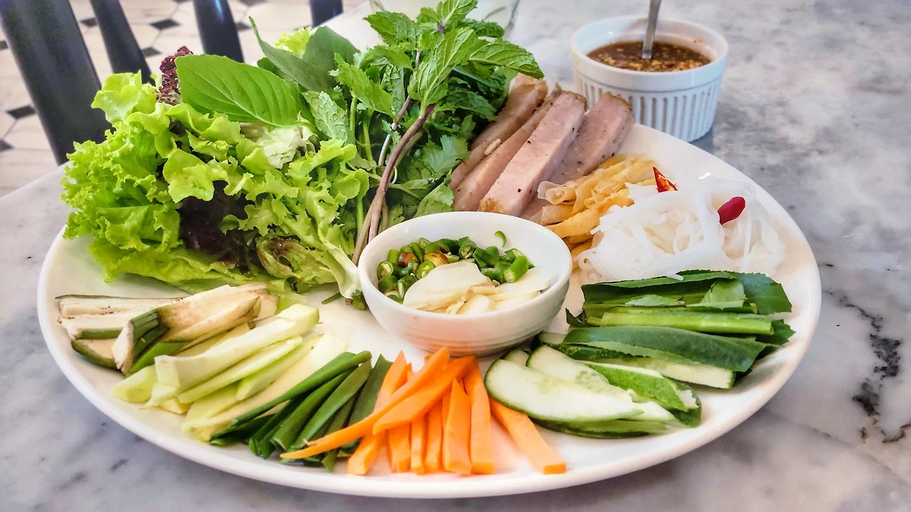 첫 번째 추천메뉴는 넴느응. 여러 가지 야채, 누들, 베트남식 소시지를 라이스페이퍼에 싸 먹는다.