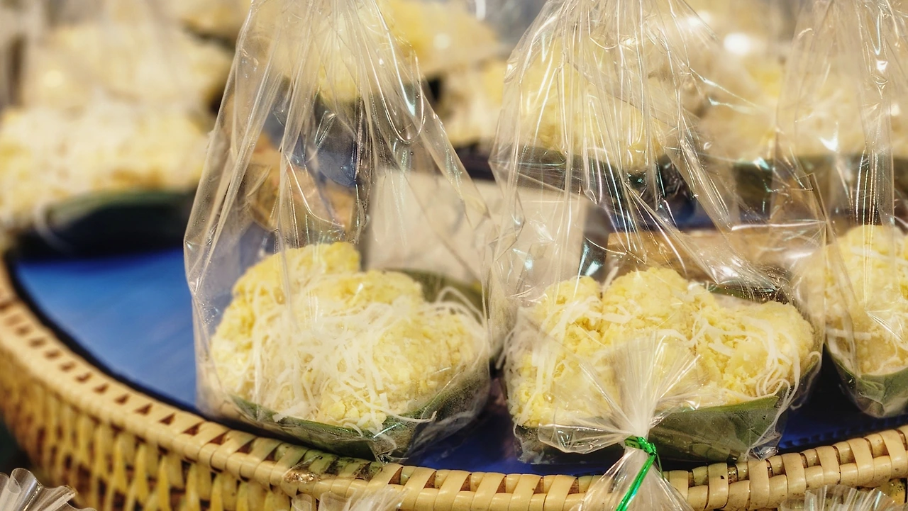 이게 카놈 투아뺍. 찹쌀떡 반죽에 삶은 녹두와 코코넛이 섞여있다.