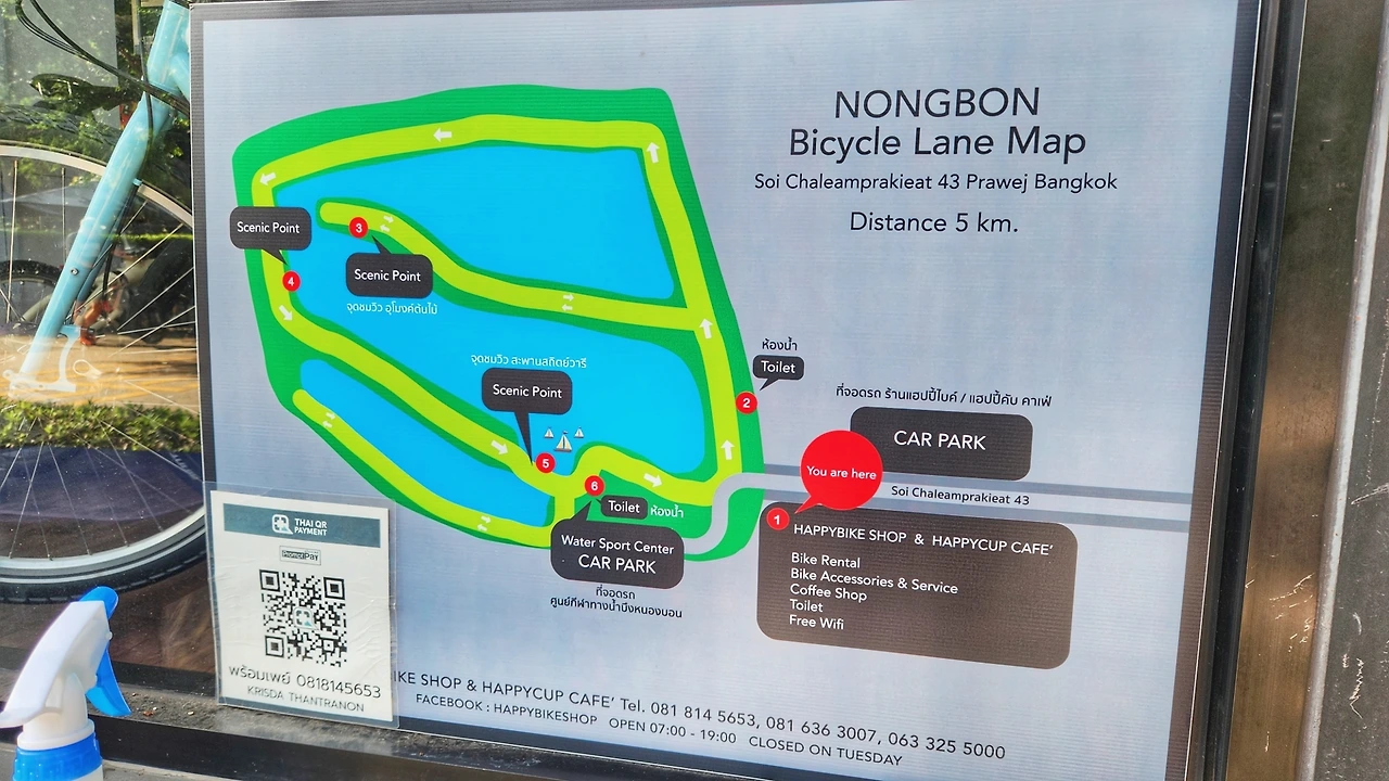 호수공원으로 들어가는 입구 바로 앞에 자리한 자전거 판매점에서 자전거를 대여할 수 있다. 가벼운 자전거는 2시간에 50밧(약 1,900원), 좀 더 튼튼하고 성능이 좋은 자전거는 2시간에 100밧(약 3,800원)이다.