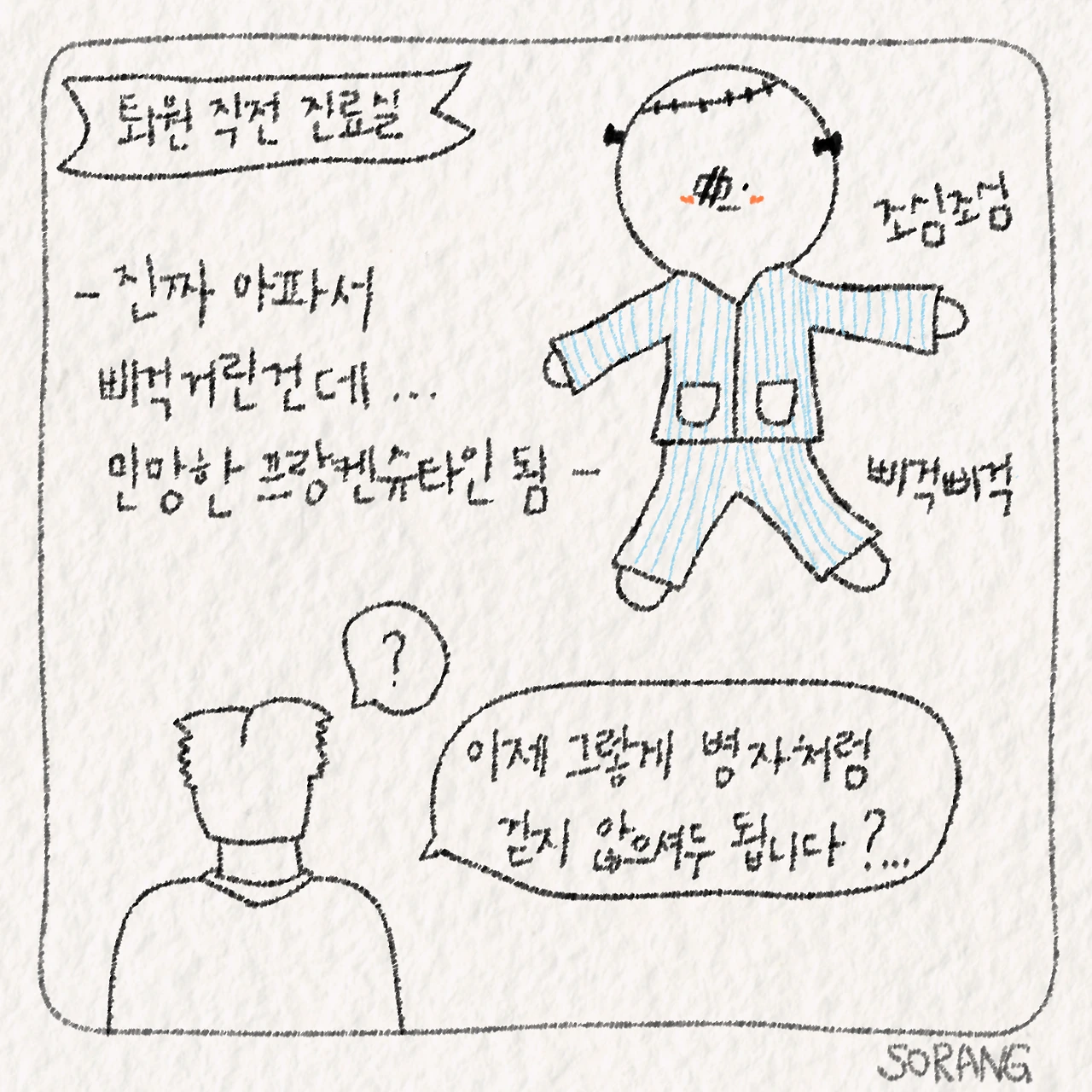 오후 6시. 당일 퇴원 직전 집도의 선생님과 마지막 진료가 있었다. 걸음을 뗄 때마다 눈알이 맘대로 움직였고 통증이 심해 진료실로 향하는 한걸음 한걸음이 조심스러웠다. 거즈로 수술한 눈을 가리고서 마치 프랑켄슈타인처럼 느릿느릿 뻣뻣하게 걸어 진료실로 들어갔다. 집도의 선생님은 그런 나를 보자마자 이렇게 말했다.