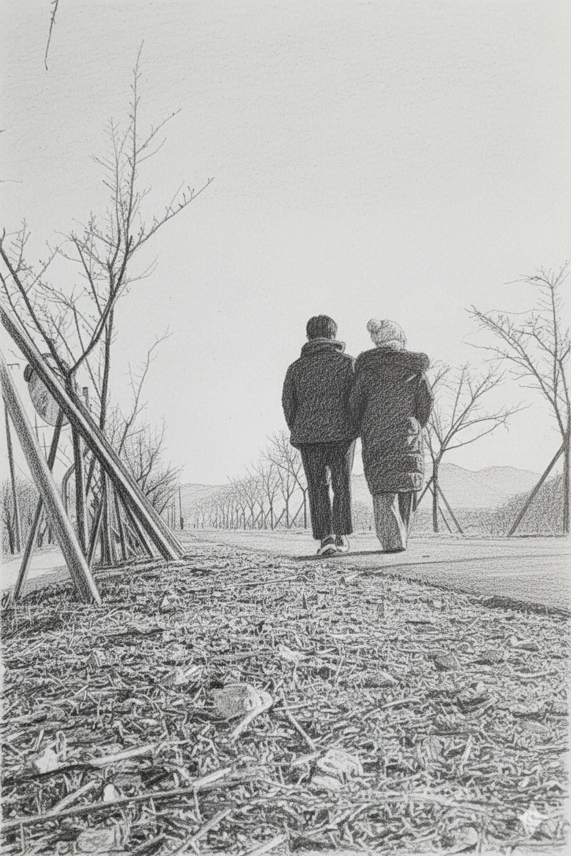 한 발짝 두 발짝 발을 맞추며 걷기 시작하자 여자는 남자의 겨드랑이를 파고들며 팔짱을 낍니다. 남자의 얼굴이 미소로 번지고 둘은 마주 보며 소리 내어 웃습니다. 그런 두 사람의 오른쪽 어깨 위로 황금색 노을이 내려앉아 눈이 부시게 반짝입니다.