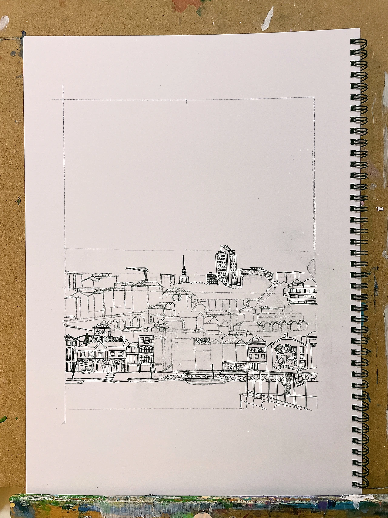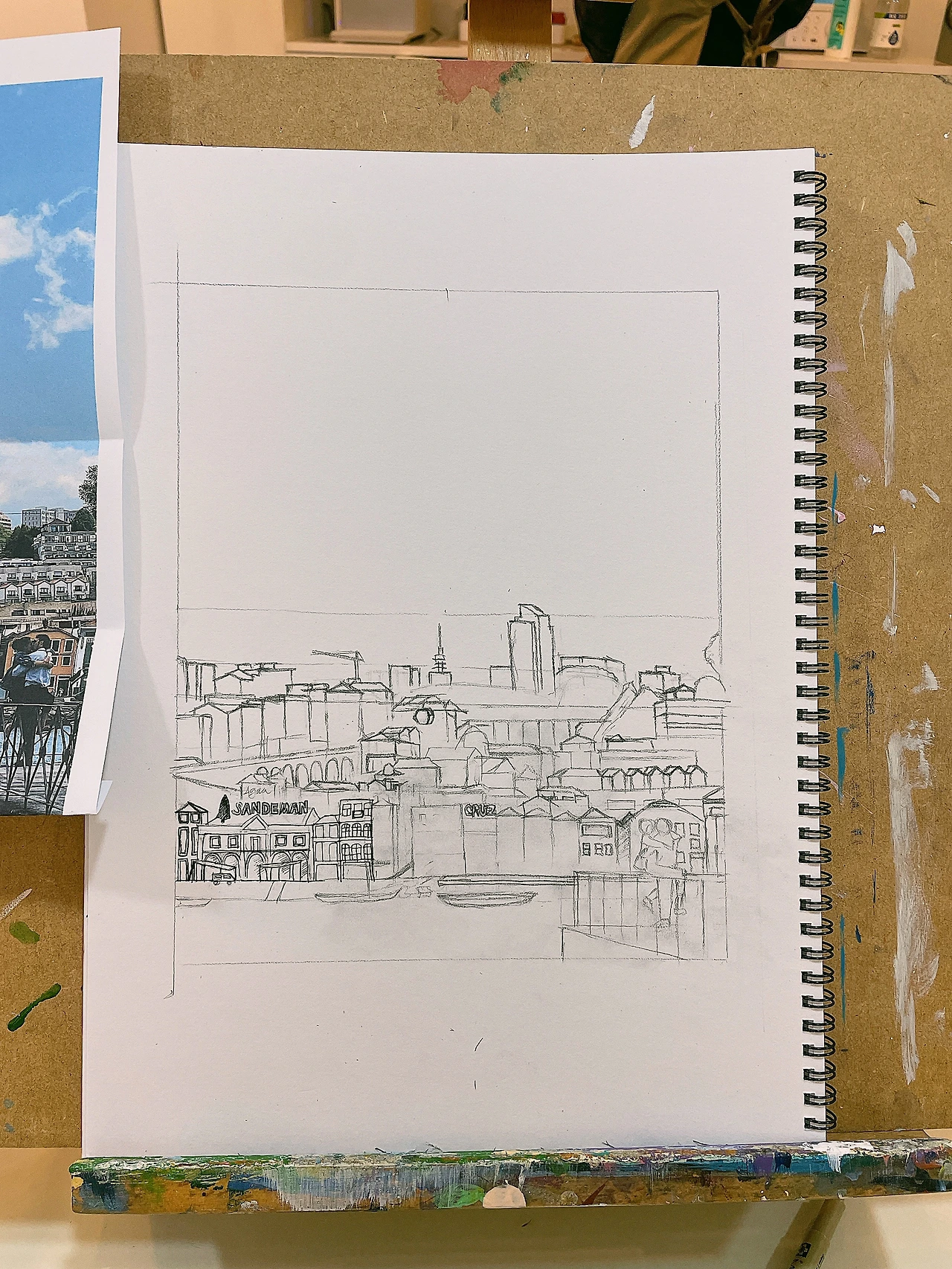 바쁜 일과 속에서도 드로잉 수업을 다녀왔다. 이번주는 이미 저번주에 예고했던 대로 그림 배우기의 목표 중 하나였던 여행지에서 찍은 사진 그리기를 했다. 그리고 고통을 맛보았다. 내가 찍은 사진인 만큼 좀 더 섬세하게 그리고 싶은 욕망과 힘들어서 그만두고 싶은 마음이 반복되어 찾아왔고, 그 중간의 절충지를 찾으려고 노력하며 참아냈던 것 같다.(?) 초반에는 연필로 전반적인 구도와 디테일을 잡아내다가 시간을 보냈다. 공간을 읽어내는 능력이 부족해서 그런지 구도를 잡는데도 시간이 꽤 걸렸던 것 같다.