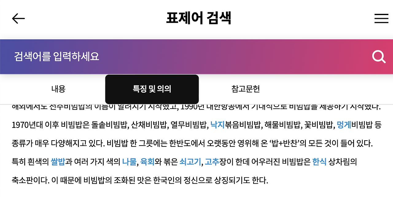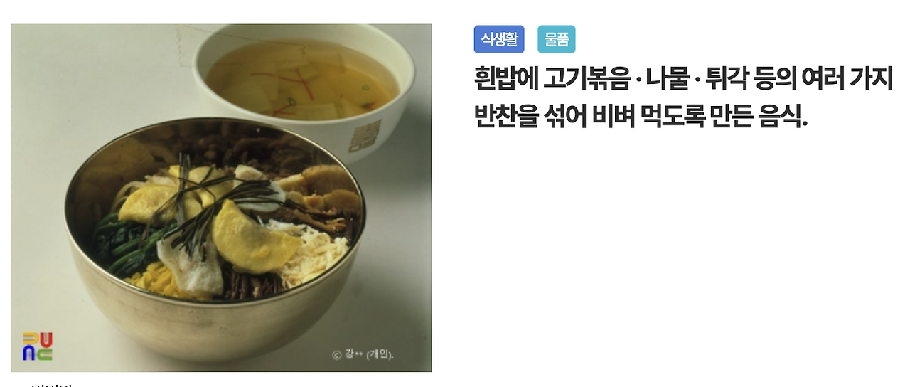 여기저기 사전을 뒤적여 나름대로 비빔밥이 비빔밥으로 정의되는 세 가지 요소(재료, 조리법, 먹는 법)를 정의해 봤습니다.