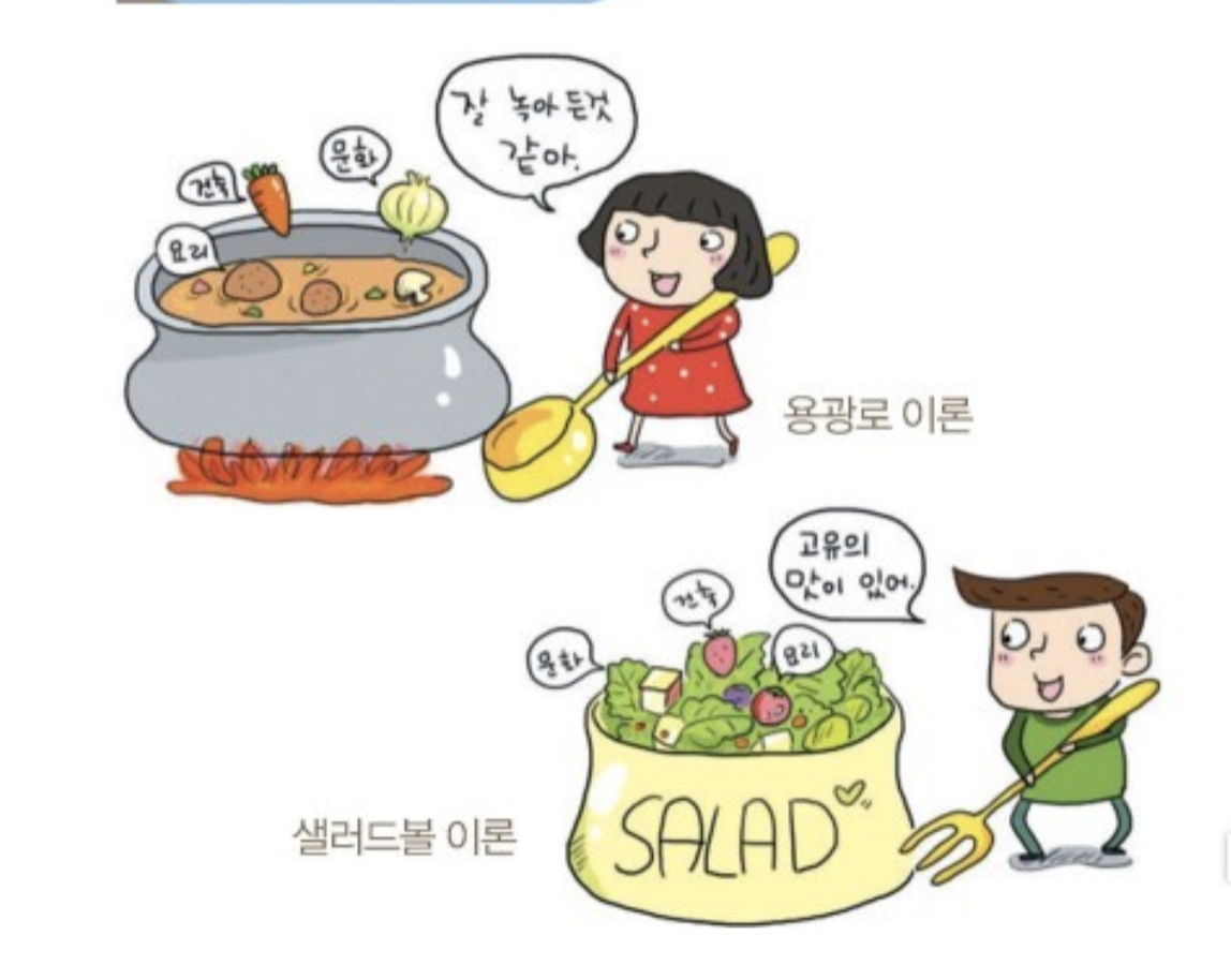 이미 다문화를 일찍이 받아들인 미국에는 샐러드볼(slada bowl)과 멜팅팟(melting pot)이라는 문화 정체성의 융합을 표현하는 말이 있다.