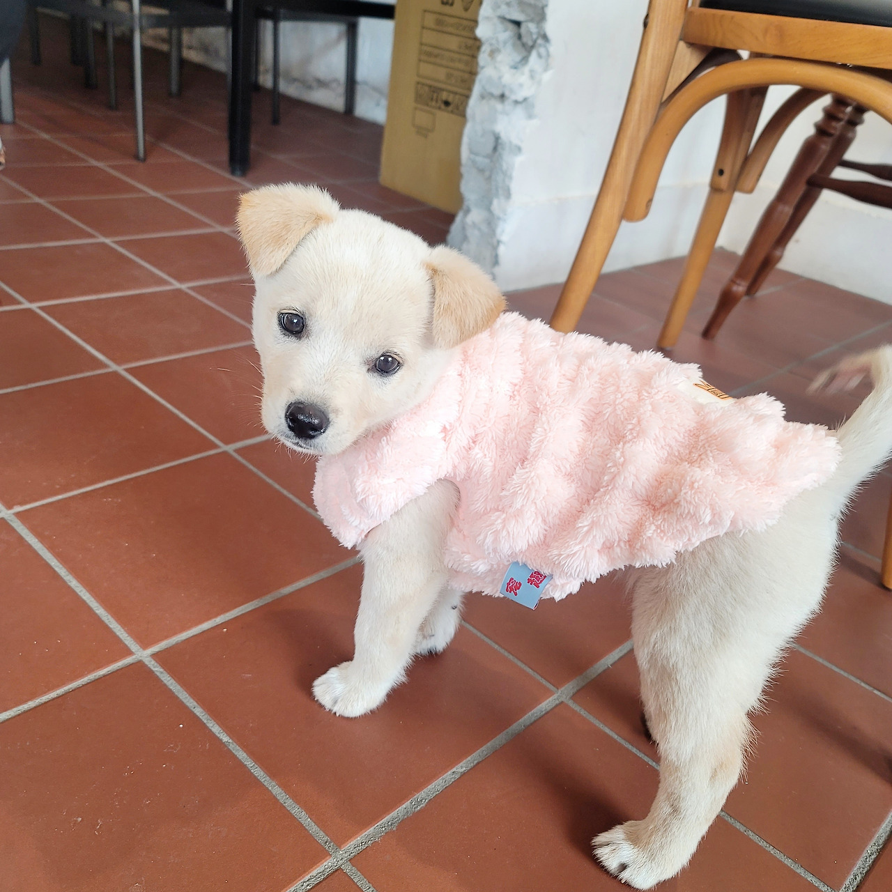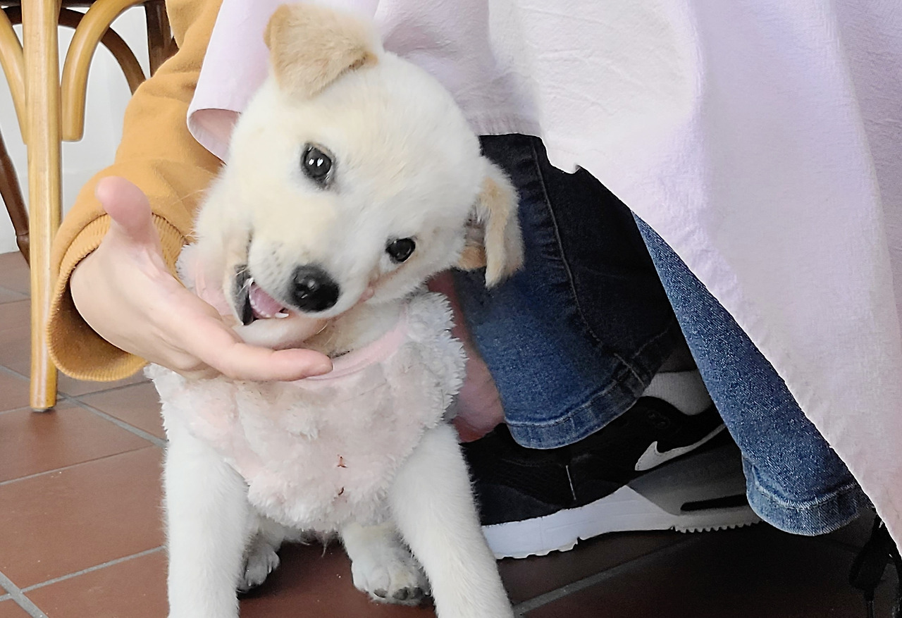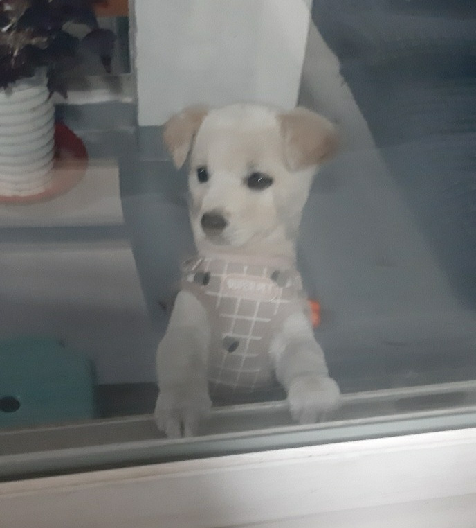어제 검정 옷은 저리 가라! 베이지털에 분홍색 옷은 정말 강아지옷 모델처럼 완벽하게 소화했다. 인형 같은 외모 옷빨이 잘 받았다. 창밖에 지나가는 사람들이 예쁘다고 손가락으로 가리키며 연신 미소를 날려준다.