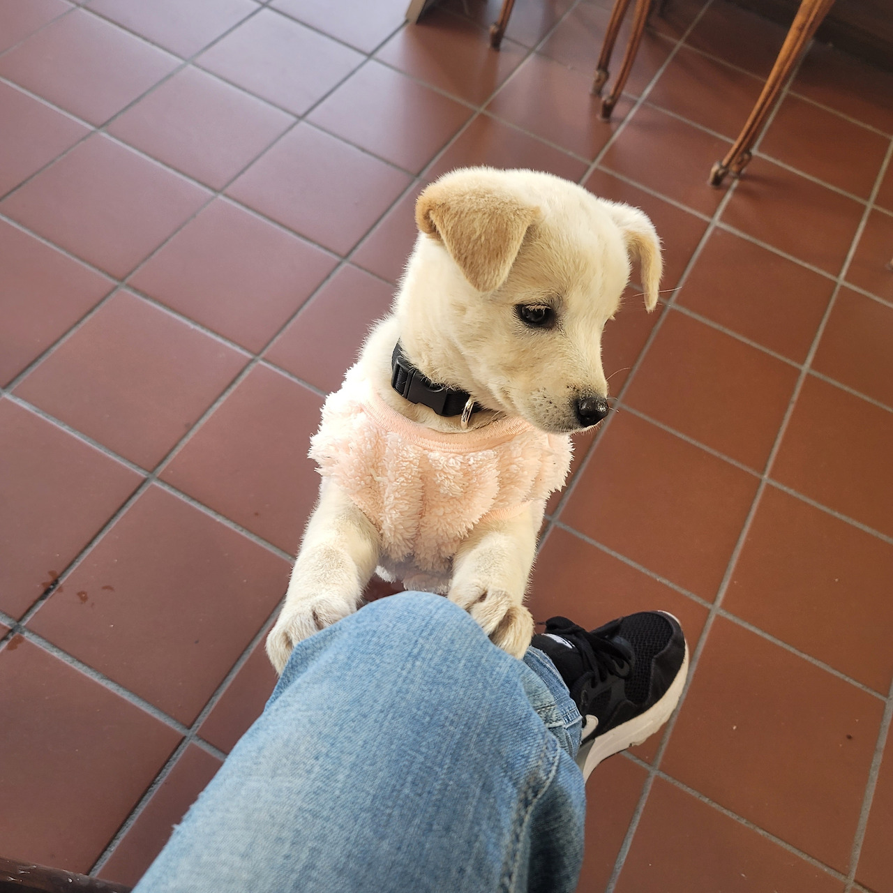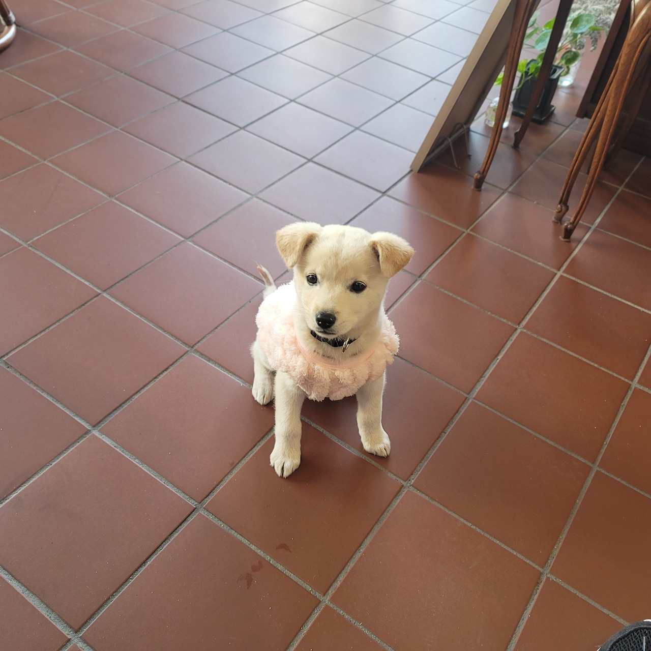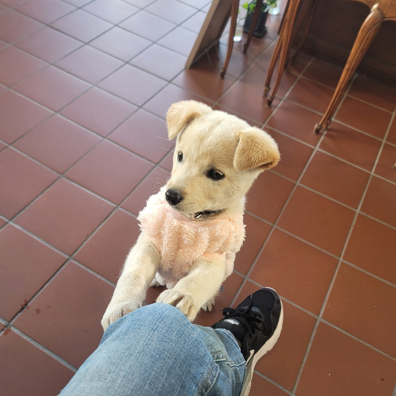 어제 검정 옷은 저리 가라! 베이지털에 분홍색 옷은 정말 강아지옷 모델처럼 완벽하게 소화했다. 인형 같은 외모 옷빨이 잘 받았다. 창밖에 지나가는 사람들이 예쁘다고 손가락으로 가리키며 연신 미소를 날려준다.