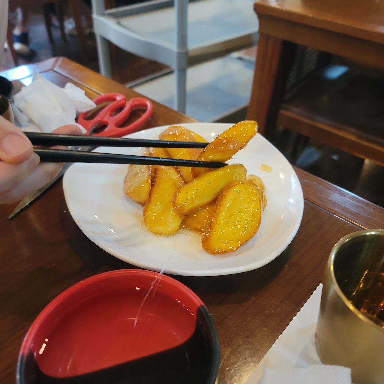 세 번째 선택받은 아이는 핫플은 아니지만 일할 때 자주 왔고 점심은 느끼했으니 핫(hot)한 걸 먹자며 훠궈를 추천했다. 다들 마라탕 먹지? 그 정도 매움이라고 했는데 아니었다. 입안에 불이 나기 시작해서 우리는 백탕에 퐁당 빠트려 먹었고 입가심으로 빠스를 주문했다. 다들 기억이 떠오르는지 모르겠지만 20년 전에 유행했던 빠스체인점 맛탕이라고 기억할 수도 있겠다. 엿처럼 쭉쭉 늘어가는 빠스를 찬물에 담가 코팅해 분리하고 하나씩 먹는 맛은 고구마의 달콤함과 겉은 바싹 속은 촉촉한 부드러움이 추억을 더해져 그 시절 먹거리를 소환해 주었다.