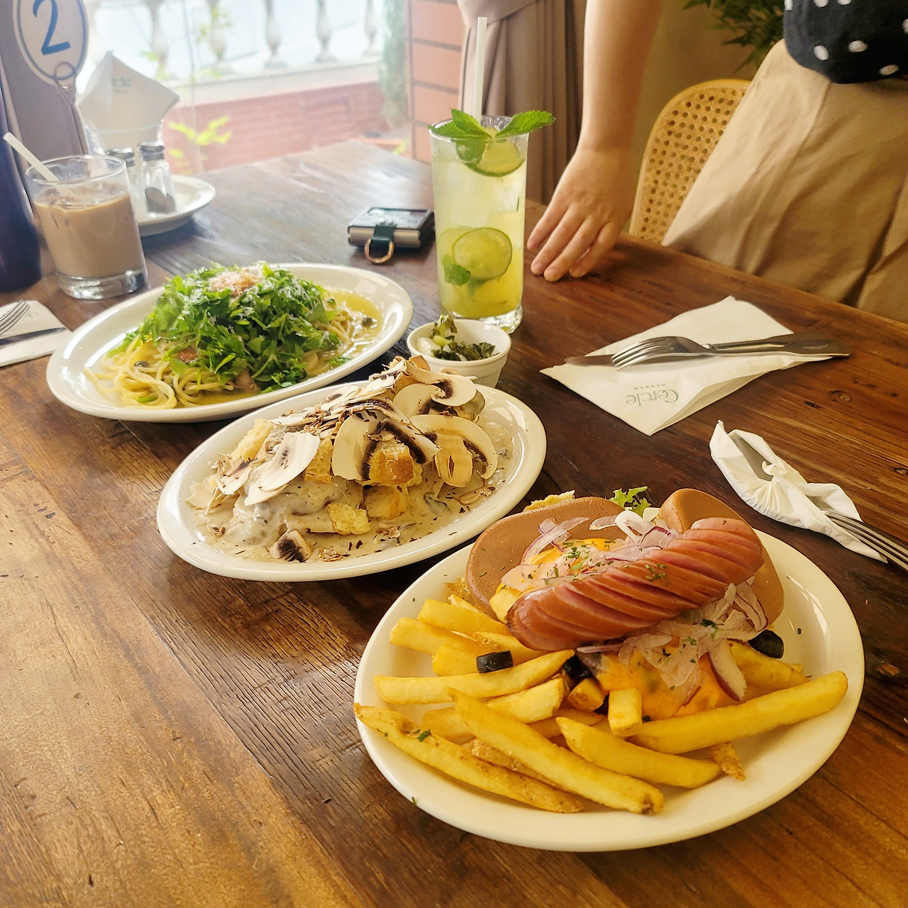 이름도 생소한 브런치들이 쫘르륵 나왔고 상큼한 색감의 음료도 식욕을 한껏 끌어올려줬다. 육아와 일에 치여 살았던 그날이여 내 머릿속을 지워주오 오일파스타의 느끼함을 미나리 특유의 맛으로 감칠맛을 더해줘서 호로록 목으로 타고 넘어갔다.