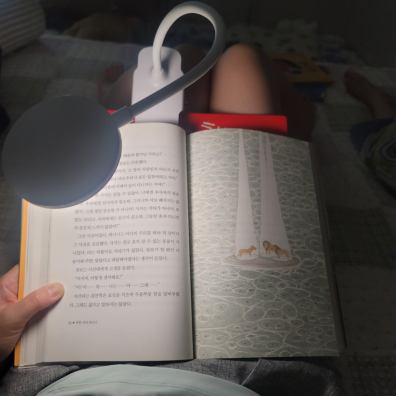 며칠 전부터 잠자리 독서를 해줘야겠다는 강한 이끌림이 들었다. 둘째가 좋아하는 동화책을 대충 읽어준다고 생각했고 쿠팡에서 집게형 스탠드를 구매했다. 불을 끄고 동화책을 3권 읽어주자 둘째는 자동으로 잠이 들었다. 첫째는 항상 내가 자야 잠드는 스타일이라 이번엔 푸른 사자와니니 책을 집어 들었다. 줄글책을 읽으려 하지 않아서 빼든 카드 네가 읽지 않으면 어미가 읽어주마 모드로 전화하기로 마음먹고 시작하는 첫날이 오늘이 될 줄이야. 한 챕터를 읽고 났는데 반응이 뭐 없고 눈이 꿈벅이는데 오호 듣고 있네? 동물 캐릭터가 어쩌고 질문이 나온다. 그다음 챕터를 읽고 나니 아이는 스르륵 잠이 들었다. 항상 10시 30분쯤 겨우 잠들었는데 책 때문인지 엄마가 옆에 있어서 그런가 아니면 손가락 때문에 고단했으지 모르지만 어쨌든 곤하게 자는 모습을 보고 있자니 짠한 마음보다 애기때 모습이 보여 울컥한 마음이 올라왔다.