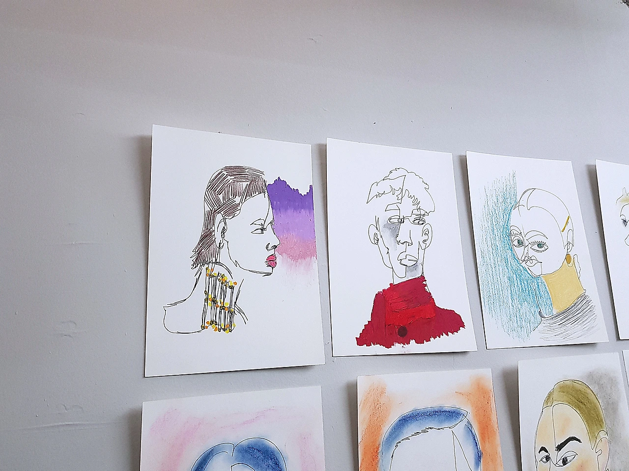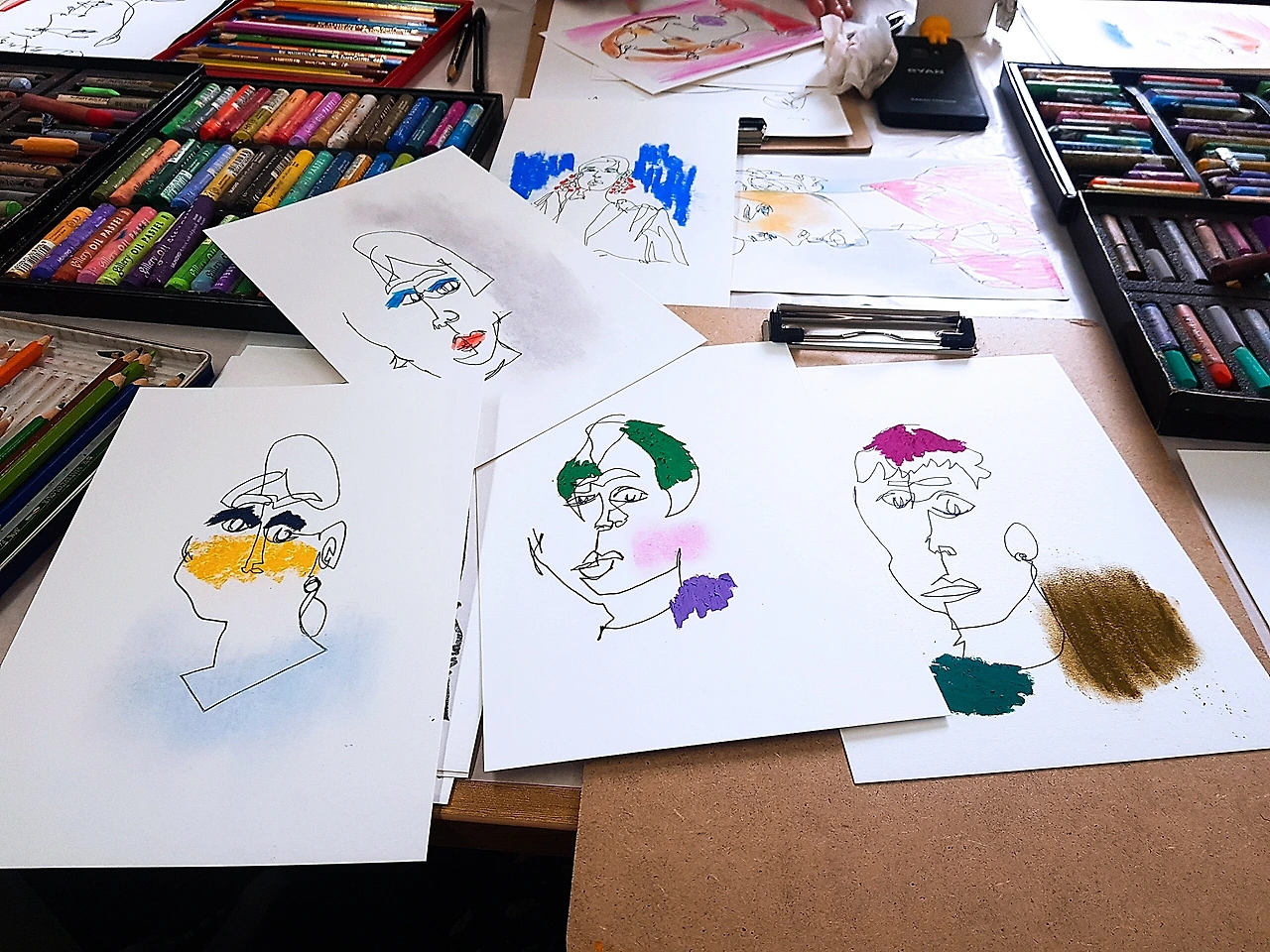 5~6명쯤 모인 수업에선 수강생들이 돌아가며 모델이 된다. 맨 앞 의자에 앉아 모델이 된 이에겐 모든 시선이 꽂힌다. 주어진 시간은 그리 길지 않다. 내 눈은 모델에게 고정, 펜을 잡은 손은 종이에 고정. 이마에서 타고 내려온 선은 눈썹, 눈, 코, 입, 턱을 타고 귀(귀걸이)를 지나 머리카락과 옷에서 착지. 한 선이 그만의 특징을 살린 한 작품으로 거듭난다. 의도와는 달리 모여라 눈코입이 될 수도 있고, 목걸이가 정수리에 붙어있을 수도 있다. 하지만 그 또한 제 나름의 스타일. 얇은 펜으로 스케치를 끝낸 후에는 채색을 위해 오일파스텔을 잡았다. 색연필이나 파스텔을 사용하는 사람, 오일파스텔로 바탕색을 빽빽하게 칠해내는 사람도 있었고 색을 칠하지 않는 사람도 있었다. 난 내가 좋아하는 색을 골라 옷과 입술, 배경 일부에 포인트 채색을 했다.