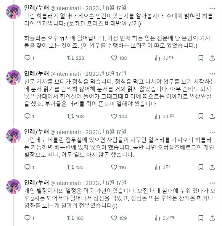 그러다 어제는 트위터에서 우연히 히틀러에 대한 트윗을 보았다. 일반적으로 알려진 것과 달리 히틀러는 엄청나게 게으르고 무능한 인간이었다(고 한다).