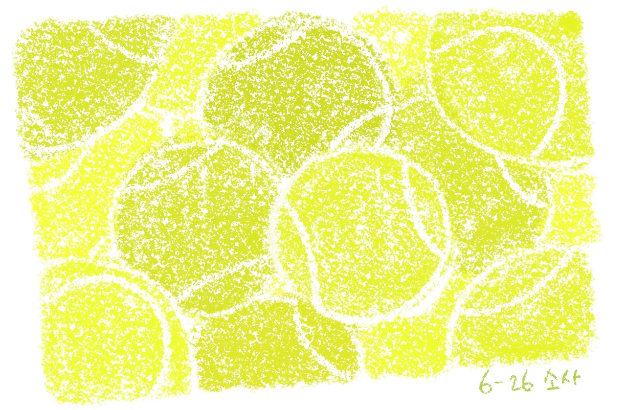 여름이 되선 테니스 수업을 시작했다. 운동을 꾸준히 하는 것은 신년 계획 중 하나였다. 태어나 테니스는 쳐본 적도 없는 나는 레벨 1 수업을 들었다. 첫 수업에서 라켓을 잡는 자세를 배우고 짧은 랠리를 진행했다. 타고나길 운동치인 나는 번번이 공을 놓쳤다. 네 명 듣는 수업에서 제일 느리고 못했다. 라켓 잡은 손은 익숙지 않고 그것 좀 뛰었다고 숨이 찼다. 집에 가고 싶은 마음에 수업 내내 몇 번이나 시간을 확인했는지 모른다. 수업이 끝난 후에 ‘재미없다’는 생각이 제일 먼저 들었다. 생각보다 힘들었고 얼마나 연습을 해야 다음 레벨로 올라갈 수 있을지 아득했다. 다음 수업에 오고 싶지 않았다.