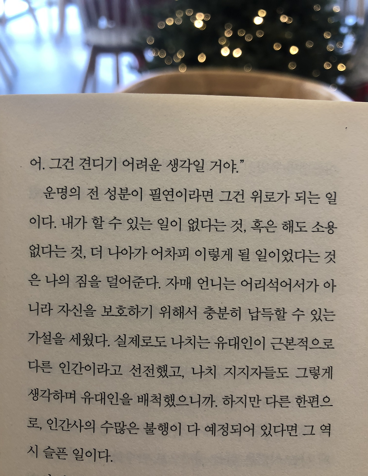 <운명>에는 삶을 받아들이는 두 가지 태도가 있다. 두 명의 인물로서 해설되는데, 하나는 운명을 필연적인 것으로 해석하는 것(안나마리아)이고 다른 하나는 운명을 우연적인 결과물로서 받아들이는 것(죄르지)이다. 홀로코스트의 피해자인 두 사람이 자신의 고통을 받아들이는 방식이 완전히 대비되는 것이다. 나는 <운명>을 읽은 것이 아니기 때문에 저자 김겨울 씨의 입장을 좀 더 진하게 맛보았다.