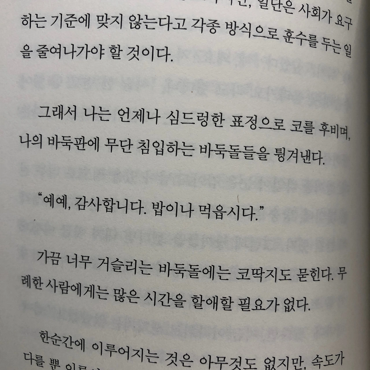 책은 전반적으로 담백했다. 아마 안예은 본인의 성향이 묻어나는 것이라고 생각한다. 그는 무뚝뚝하고, 상대적으로 상처를 덜 받고, 잘 울지 않는 자신의 성격을 잘 알고 있다. 선을 넘지 않고 무심하게 툭, 자신의 의견을 테이블 위에 내려놓는 듯한 그런 느낌. 수심 깊은 이야기를 할 때에도 그렇다.