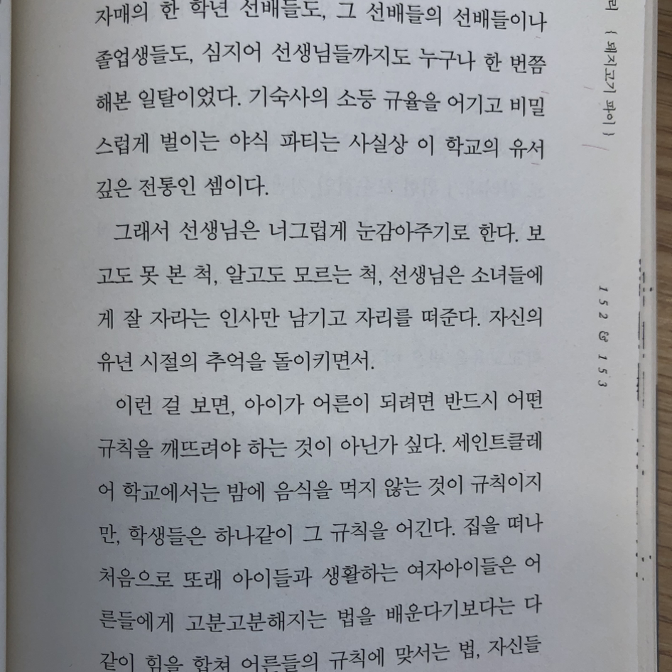 사감 선생님은 바닥에 어질러진 야식의 잔해 -그러니까 돼지고기 파이-를 보고도 못 본 척해주고, 자신의 유년 시절 추억을 돌이키는 주체적 인물로 묘사된다. 그 마음 씀씀이에 괜히 감동받는 것은, 이제 내가 어른의 반열에 들어섰기 때문일까.