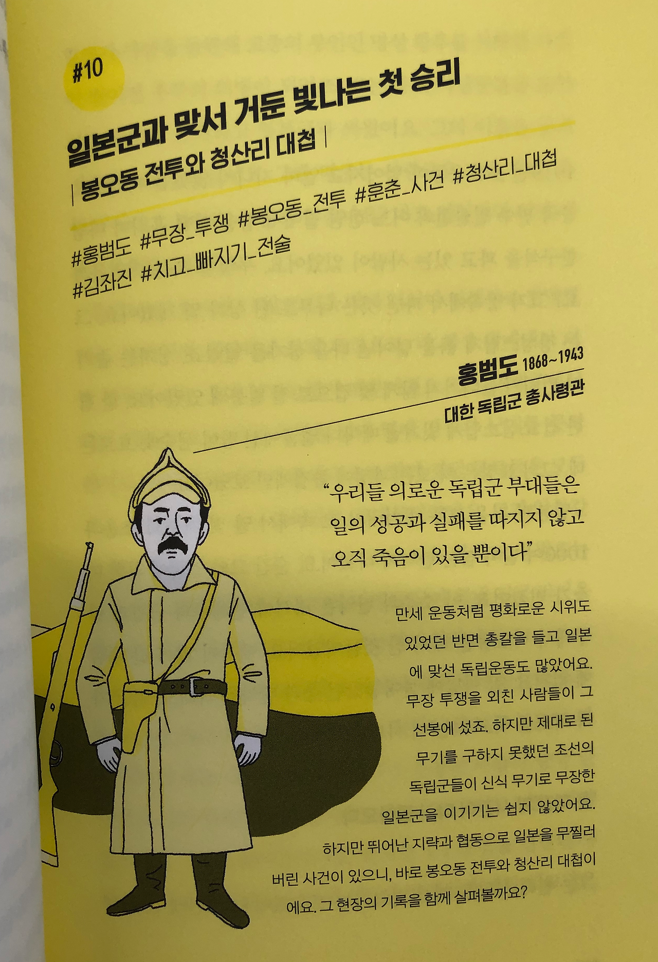눈 가리고 아웅 식의 역사왜곡에 넘어가 줄 생각은 한 치도 없지만, 그것과는 별개로 역사 공부를 절대 소홀히 해서는 안 되겠다는 깨달음을 크게 얻은 것 같다. <청소년을 위한 #해시태그 독립운동사>에서 홍범도 장군과 봉오동 전투 분량은 5페이지가 채 안 되는 적은 분량이지만 이렇게 할 말이 많다. 책에 언급되지 않은 독립운동가들은 또 얼마나 많을 것인가.