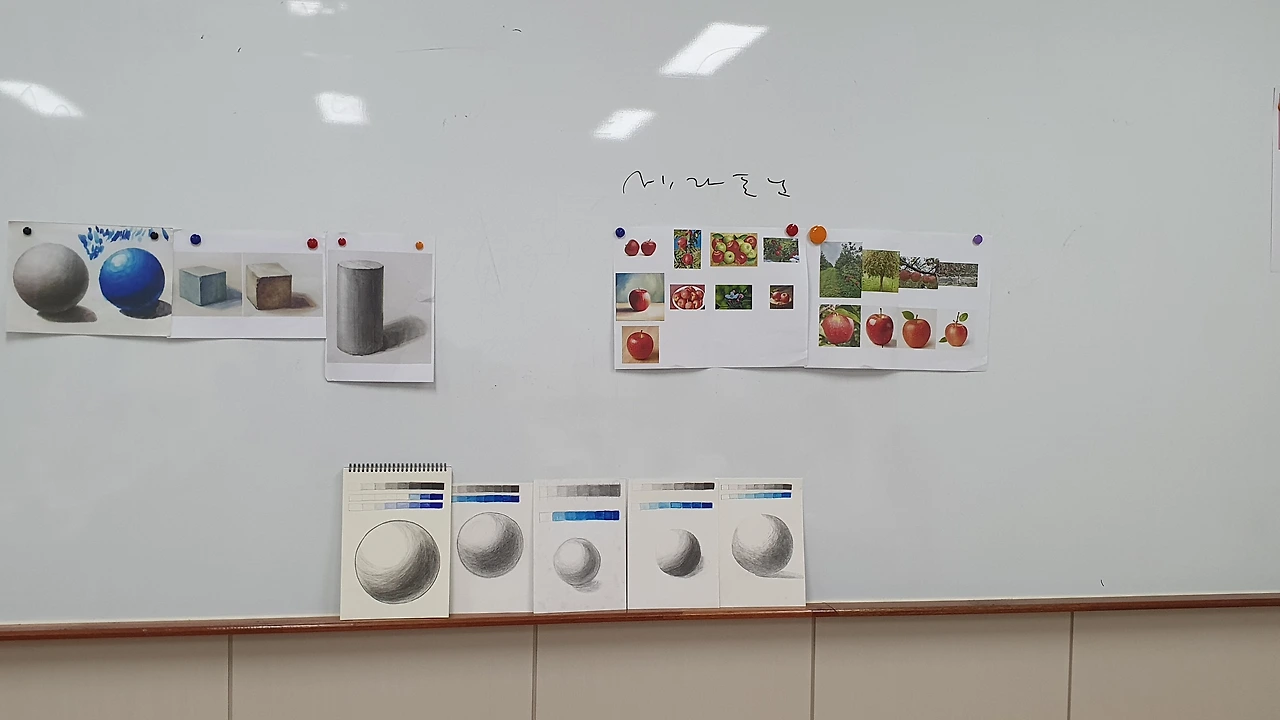 지난학기에도 수강한 재수강생들은 사과를 그렸다. 선생님께서는 인터넷에서 사과 판매자의 농장의 사과 나무와 사과의 사진을 여러장 출력해 오셨다. 수업 자료가 있으니 어떤 설명보다 직관적으로 질감과 색채를 느끼고 반영해서 그림을 그릴 수 있어서 좋았다. 실물자료가 있으면 수업이 한결 수월해짐을 체감할 수 있었다.