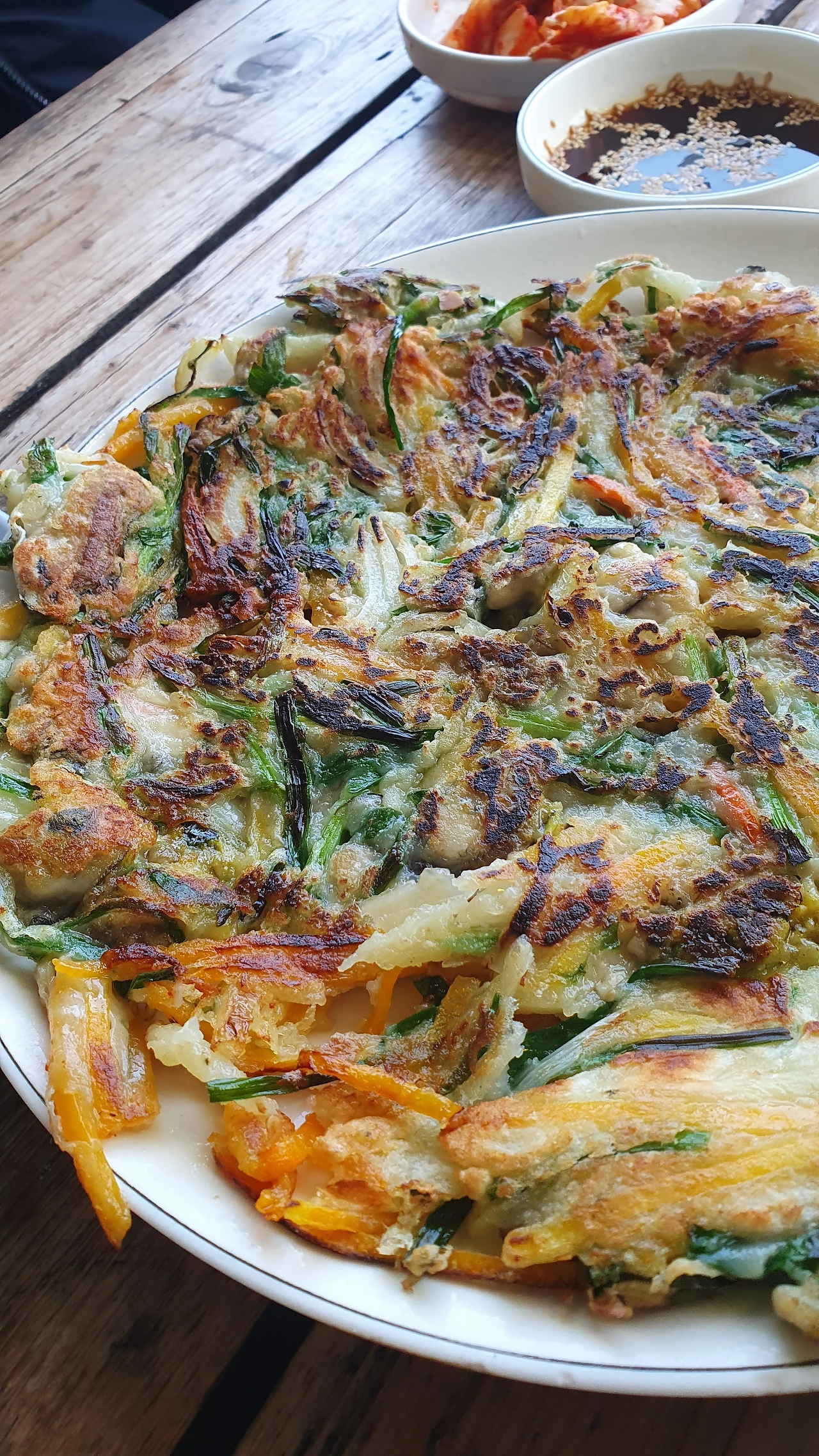 4-5센치 정도로 자른 야채를 밀가루 반죽에 넣어 섞는다. 전을 부치기 직전에 반죽과 야채를 섞으면 보다 아삭하고 신선한 식감을 살린 전을 먹을 수 있다. 후라이팬에 기름을 두르고 센불에서 한 면을 구운 다음 뒤집고 중불로 낮춘다. 전은 두꺼우면 맛이 없으므로 숟가락이나 뒤집개로 꾹꾹 눌러가며 굽는다. 소스는 간장, 물, 참기름, 식초, 고춧가루 등 좋아하는 걸로 적절한 비율로 내 맘대로 섞어주면 준비 끝.