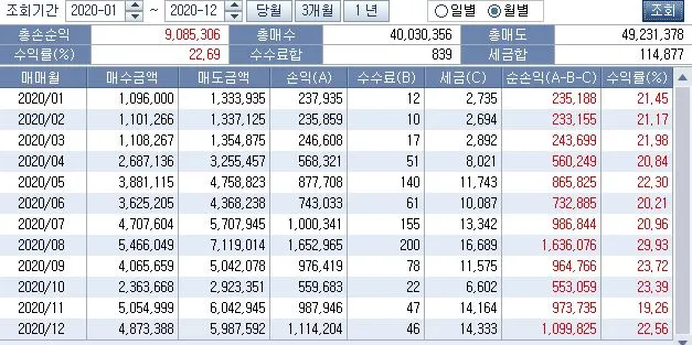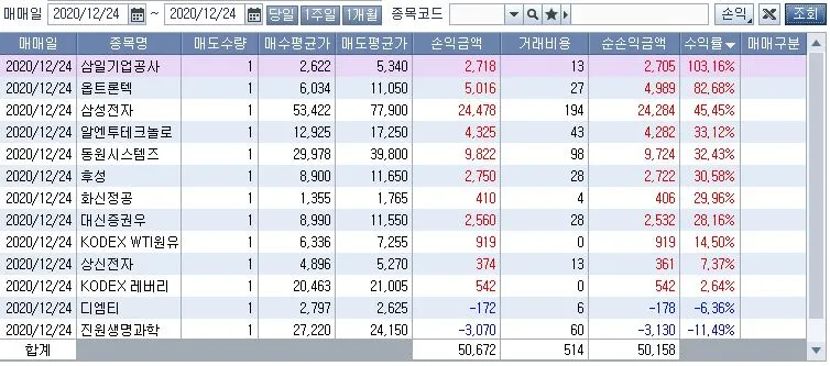눈이 오나 비가 오나 주식 시장이 개장을 하면 여전히 한 주씩 매매를 하고 있습니다. 크리스마스인 오늘은 주식 거래를 할 수 없어서 어제 거래한 내역을 올려 봅니다. 주가가 단기간에 너무 상승해서인지는 몰라도 어제도 무려 47포인트나 지수가 상승했지만 투자 수익은 그렇게 좋지가 못합니다. 그나마 어제는 삼성전자가 또 한 번 최고가를 치면서 목표 매도가에 도달해서 한 주 매도를 해 겨우 하루 수익 5만 원 찍었습니다. 하루에 평균적으로 최소 5만 원의 수익을 봐야 매달 백만 원의 수익을 기대할 수 있겠죠. 2020년의 마지막 달에 매도 체결 수익이 백만 원을 넘었네요. 8월에 이어 두 번째로 월 수익 백만 원을 달성했습니다. 아직 12월이 끝난 건 아니니 12월 수익금은 약간 더 증가하겠지만 8월만큼은 힘들겠네요.