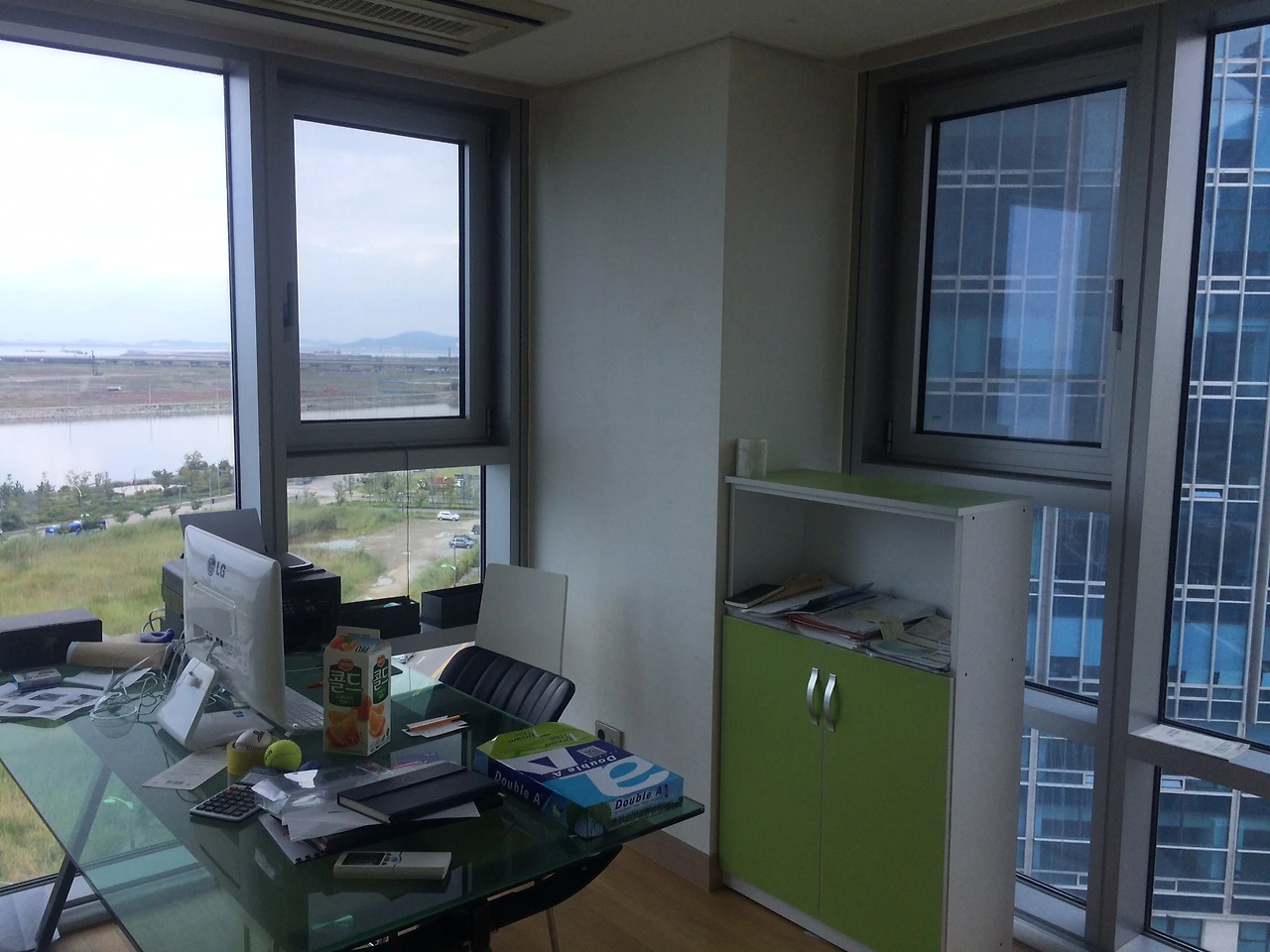 두 번째로 본 곳이었습니다. 여기도 대박이었습니다. 위와 동일하게 보증금 1000, 월세 110이었는데 평형대는 훨씬 넓었습니다. 그리고 무엇보다도 모든 방과 거실이 거의 정사각형 형태로 하나의 공간을 이루고 있었습니다. 그래서 더 넓어 보였습니다(평형 70평, 전용면적 38평) 화장실은 하나였지만 에어컨도 네 개나 있고, 히터도 있었습니다. 신기하게도 송도에서 알아본 큰 평형대의 오피스텔은 바닥 난방이 되지 않고 히터가 있는 곳이 많았습니다. 벽도 많지 않고 하나의 큰 형태로 된 공간이라는 점이 너무너무 마음에 들었습니다. 그리고 창가에는 나름 물도 흐르고 주변에 산책로, 학교, 주거지역도 많았습니다. 확실히 송도 신도시는 공원도 많고, 도심도 잘 정리되어 있어서 부천보다 환경이 훨씬 좋았고 집도 보는 순간 어떻게 뭘 둘지 막 고민이 되기 시작했습니다!