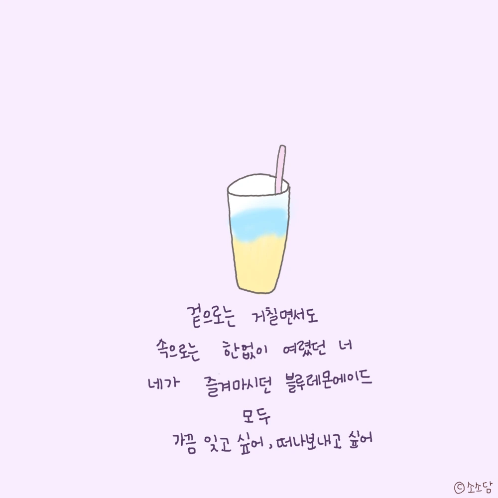 나는 블루레몬에이드를 원래 좋아하지 않아 시킬 일은 없고, 그와 함께 들었던, 또는 그를 떠올리게 되는, 첫 소절부터 마음이 쿵하고 내려앉던 노래들은 자연스레 덜 듣게 되었지만,