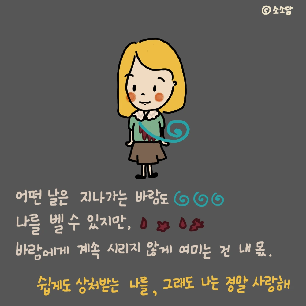상처라고 부르고 싶지도 않은 무딘 바람에 꽤 세게 베인 날, 이상하게도, 이런 작은 상처에도 베이는 내가 좋았다.