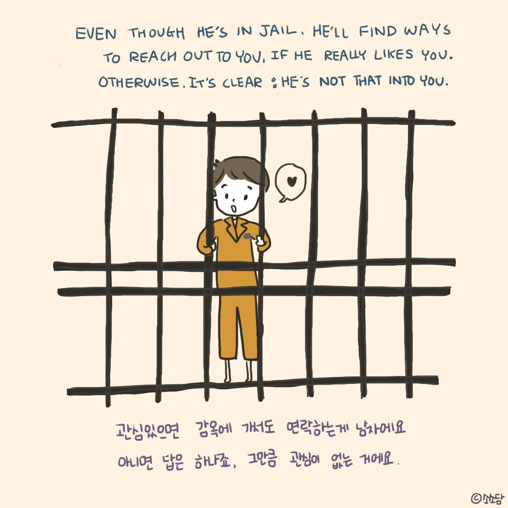 남자는 관심 있으면 감옥에서도 연락해요그렇다 남자가 관심 있으면 “수단과 방법을 가리지 않고” 연락한다는 것은 어떤 사람에게 물어봐도 같을 듯사실 이건 남녀 구분이라기 보단... 좋아하는 사람이 생기면 사람이 하는 행동이지만남자는 특히나 관심 있다면, he’ll chase you하긴 근데 몰라서 못하나, 마음이 나대는 걸
