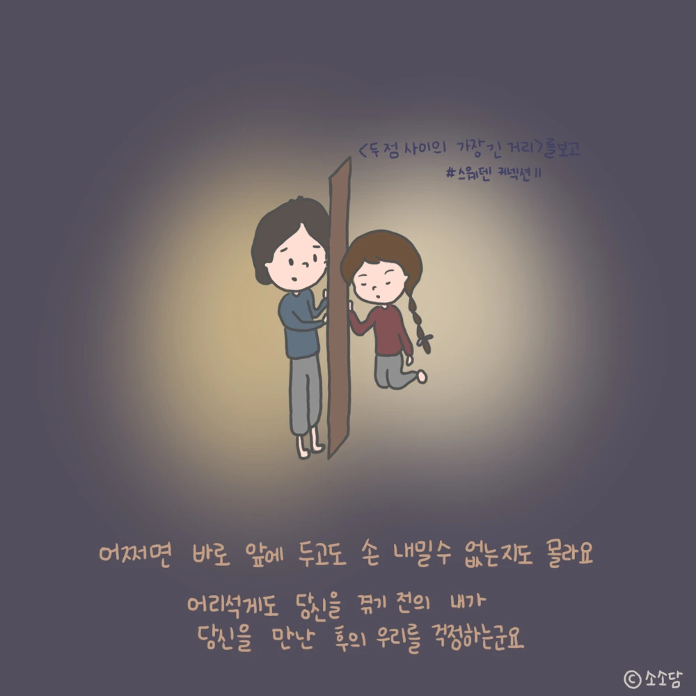 문득 저는 나아가지도 물러서지도 못하는, 서로가 가진 과거의 모습들로 인해, 새로운 마음으로 향하지도, 그렇다고도 등 돌릴 수도 없는 강한 마음을 느꼈습니다.